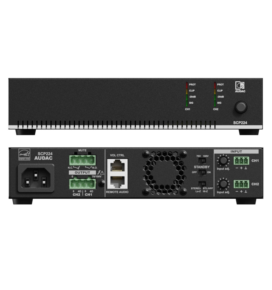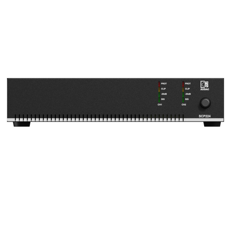 Audac SCP224 kompaktowy dwukanałowy wzmacniacz mocy będący w stanie dostarczać po 240 W na kanał przy 4 Ohm. Może zostać użyty w trybie stereo o niskiej impedancji lub w trybie mostka 70/100 V. Urządzenie charakteryzuje się zrównoważonym i niskim zużyciem energii, dzięki czemu jego koszty eksploatacyjne są niskie.