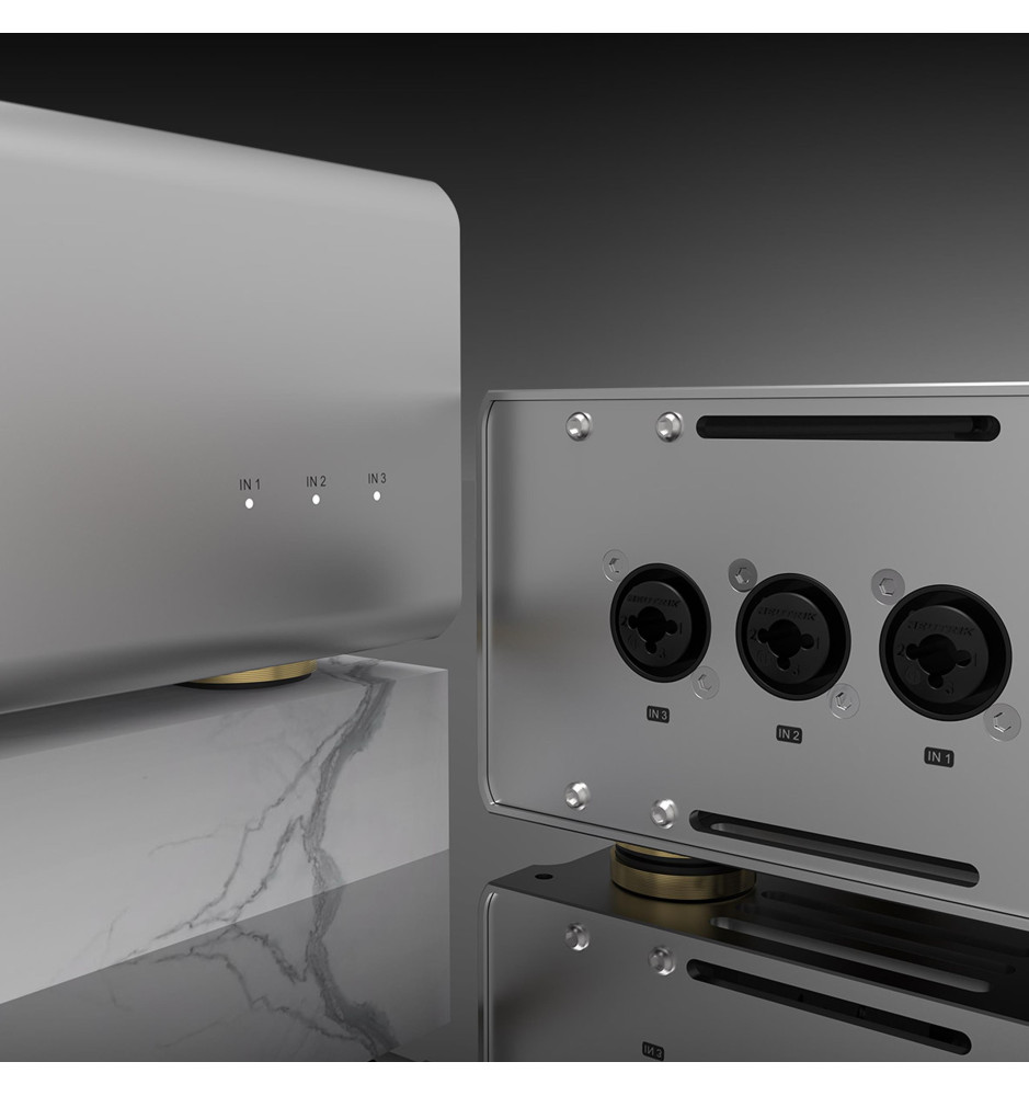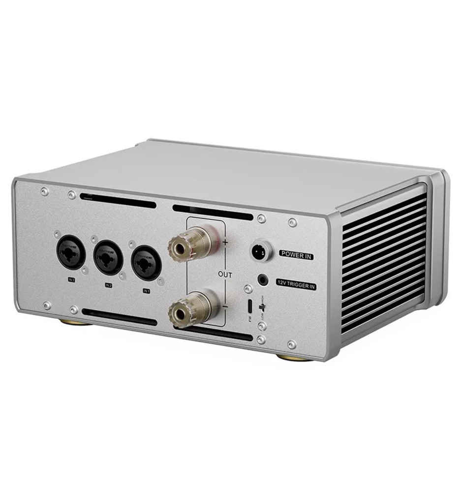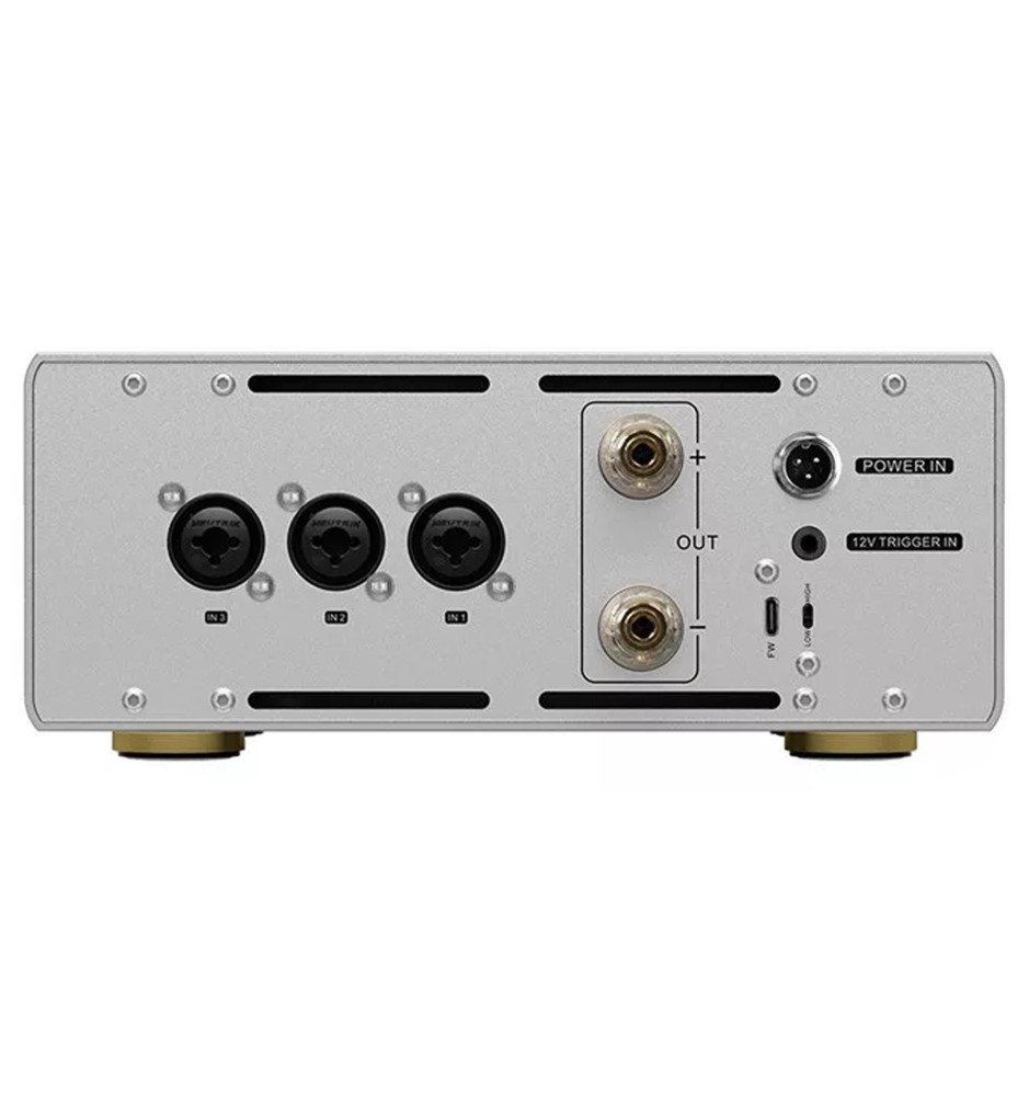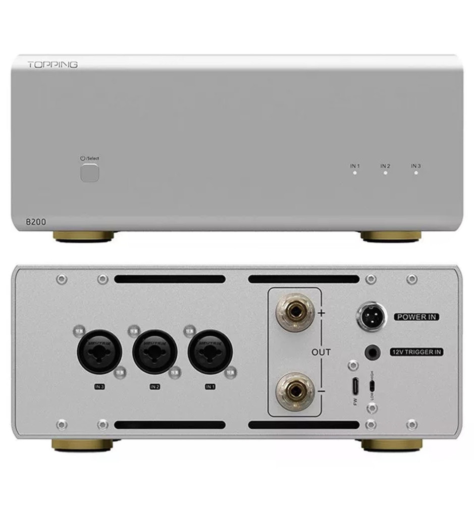 Wzmacniacz Topping B200 został wyposażony w trzy złącza wejściowe typu combo XLR/TRS, przełącznik wzmocnienia, złącze Trigger 12V oraz przycisk wyboru wejścia, umożliwiające łatwą integrację z wieloma urządzeniami i systemami audio, co sprawia, że jest uniwersalnym rozwiązaniem zarówno do użytku profesjonalnego, jak i domowego.