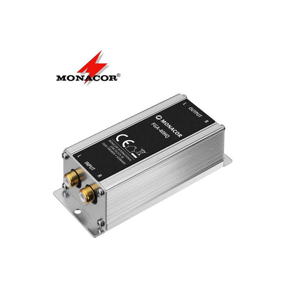 HI-END'owy separator masy Monacor FGA-40HQ służący do eliminacji zakłóceń oraz przydźwięków związanych z zapętlaniem się masy podczas podłączenia radia samochodowego do wzmacniacza.
