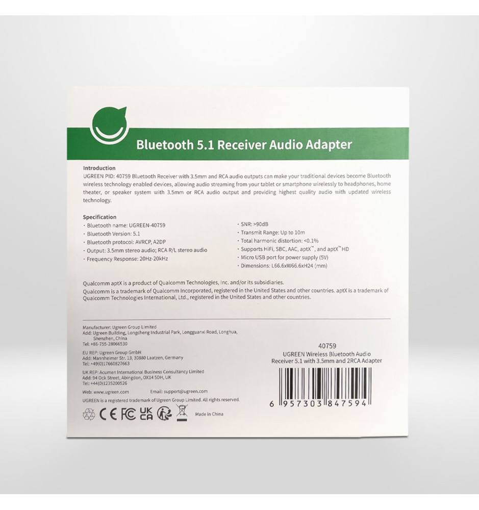 Odbiornik Ugreen, dzięki technologii Bluetooth 5.1 z obsługą kodeków aptX, pozwala na odbieranie muzyki przesyłanej z dowolnego urządzenia bezprzewodowego w wysokiej jakości, bez strat, zakłóceń i opóźnień sygnału. Wbudowane złącza RCA oraz 3.5mm jack gwarantują kompatybilność z większością urządzeń audio, takich jak aktywne głośniki, amplitunery oraz przedwzmacniacze.