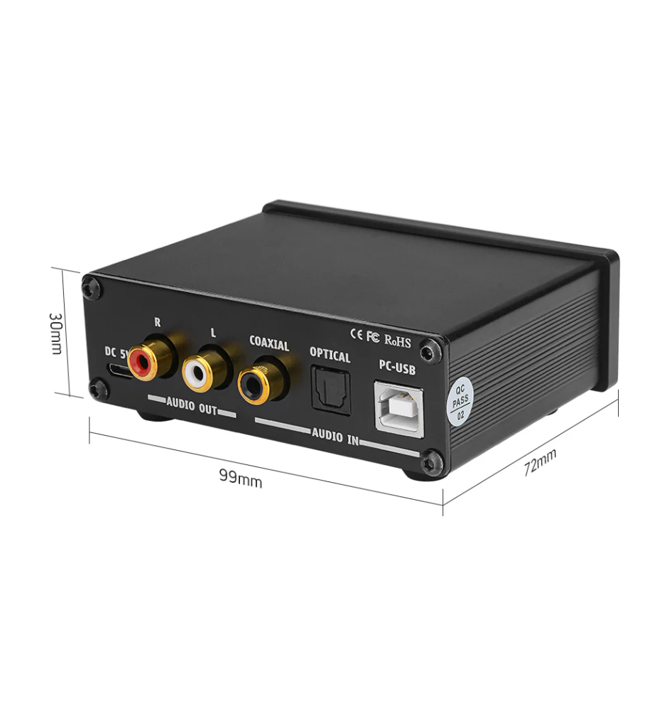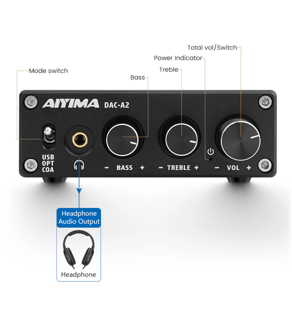 Dzięki wymiarom 73,5 × 98 × 33 mm (bez pokręteł i złączy) oraz zasilaniu DC 5V, AIYIMA DAC-A2 idealnie sprawdzi się w każdym zestawie audio – zarówno biurkowym, jak i domowym. Solidna obudowa zapewnia trwałość i estetyczny wygląd urządzenia.
