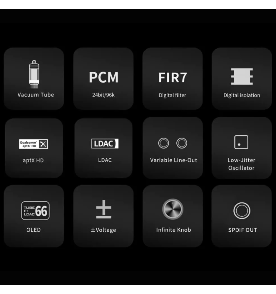 Kompatybilny z Hi-Res Bluetooth (Bluetooth 5.1) odbiornik DAC o lampowym brzmieniu — łączy nowoczesne kodeki (LDAC, aptX HD) z ciepłą sygnaturą lampy ECC82. Ma zmienny wyjściowy poziom liniowy, cyfrową izolację i komplet wyjść (RCA, koaksjalne, optyczne) — idealny do wzmacniaczy, aktywnych kolumn i systemów AV.
