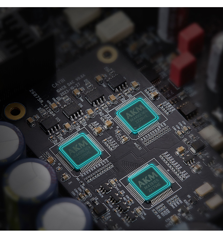 Cayin iDAC-8 posiada w pełni zbalansowany układ DAC, bazujący na dwóch chipsetach AK4499EX, po jednym na każdy kanał, oraz pojedynczym flagowym modelu AK4191 od AKM. Taka konfiguracja, pracująca w podwójnym mono, uwalnia pełny potencjał przetwarzania sygnału cyfrowego na analogowy.
