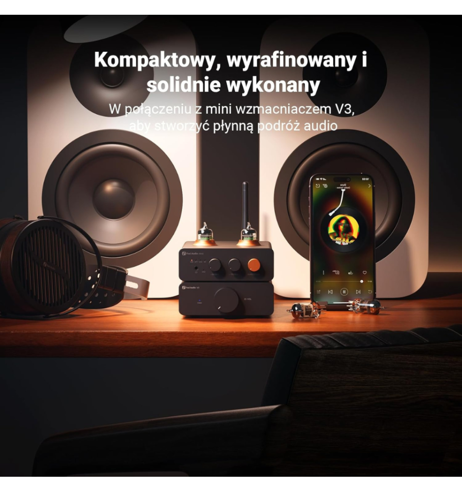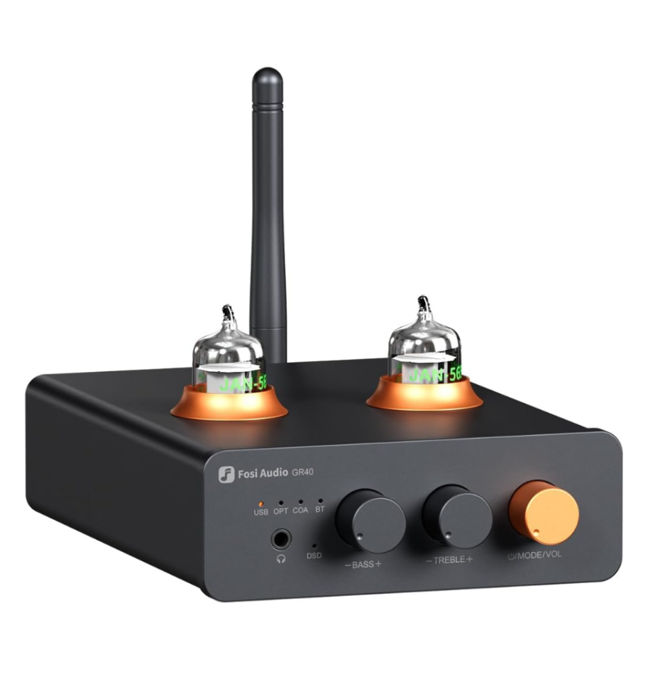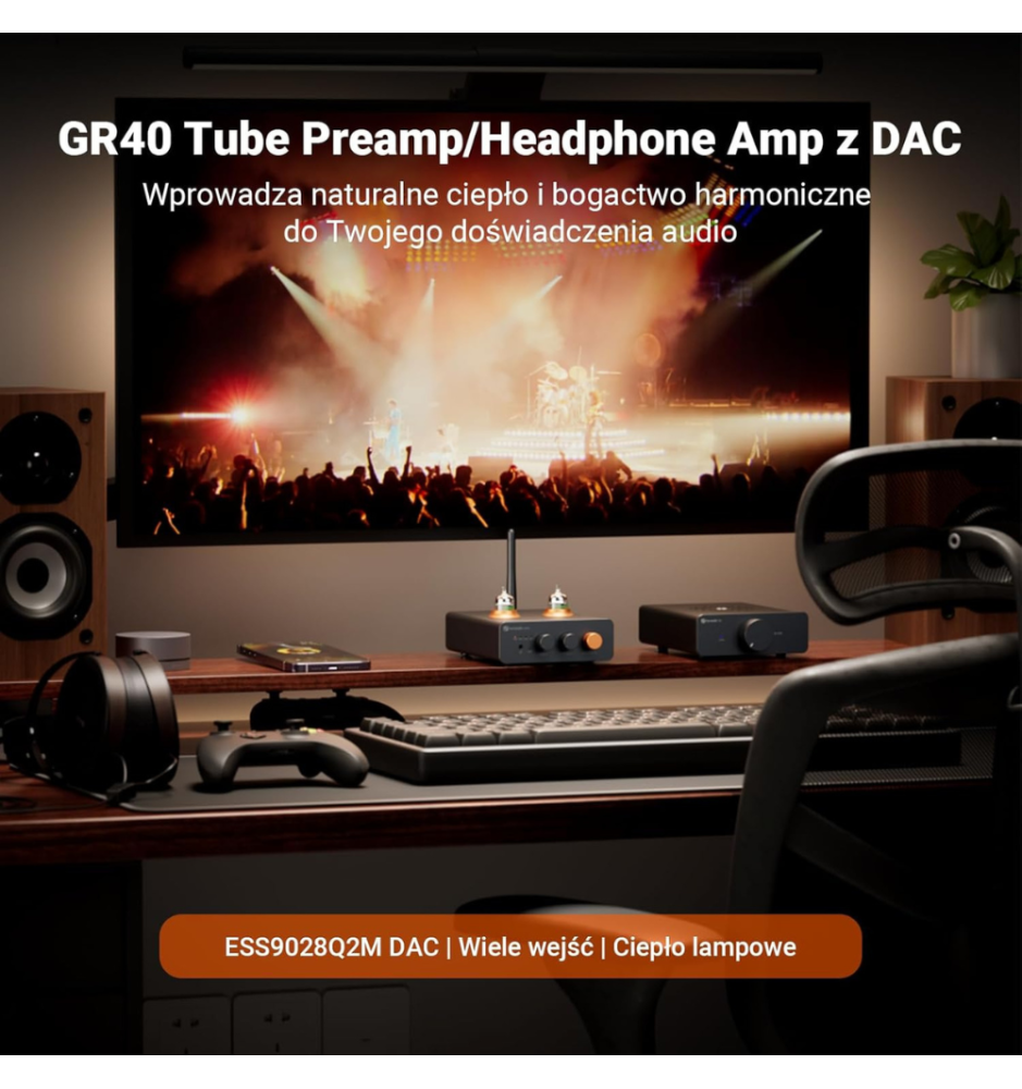Fosi Audio GR40 to lampowy DAC/AMP z układem ESS9028Q2M, Bluetooth aptX-HD, obsługą PCM 32/768 i DSD512 oraz mocnym wyjściem słuchawkowym, zapewniający czyste, szczegółowe brzmienie.