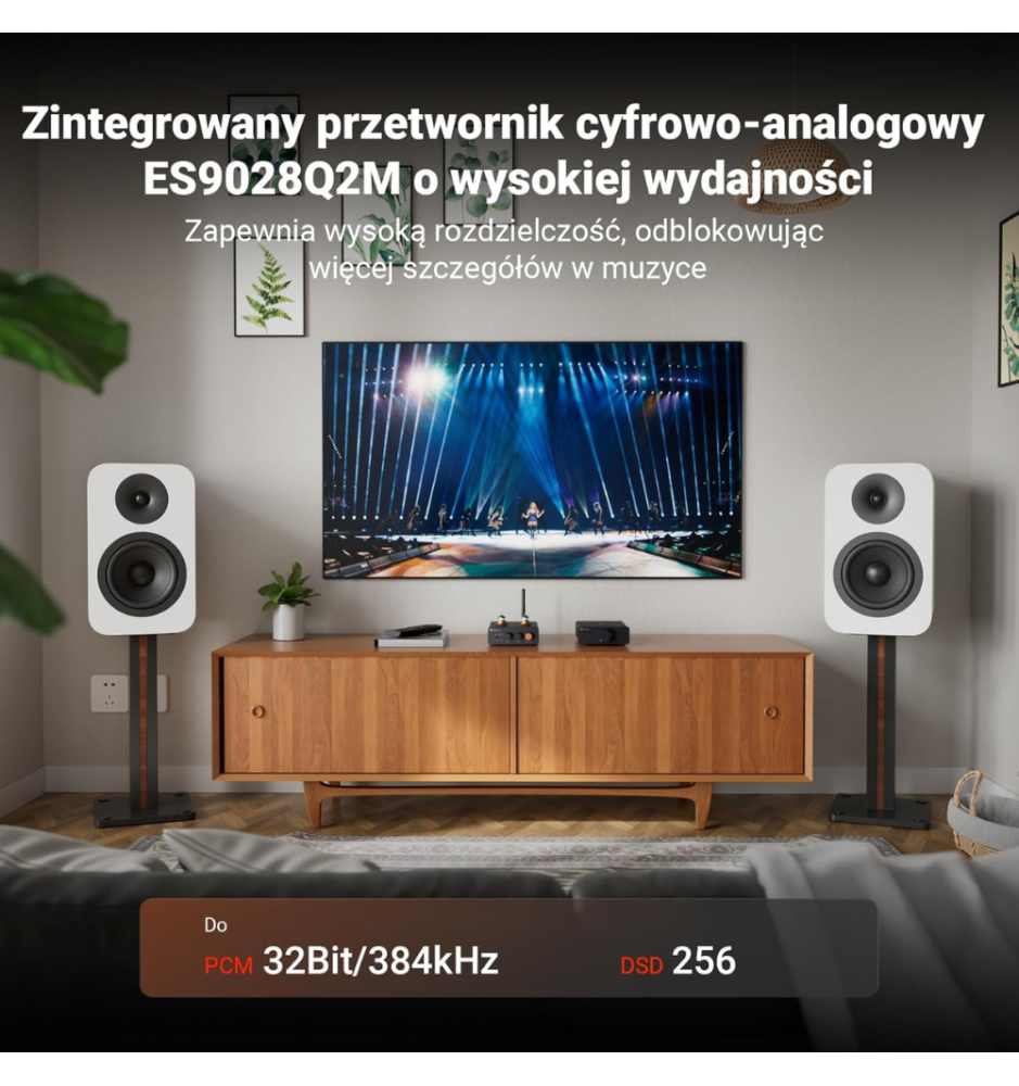 Za precyzyjne i czyste brzmienie odpowiada układ DAC ESS9028Q2M, który oferuje obsługę USB do 32-bit/384 kHz oraz DSD256. Urządzenie skutecznie redukuje szumy, dostarczając dźwięk w pełni bezstratny i niezwykle szczegółowy.