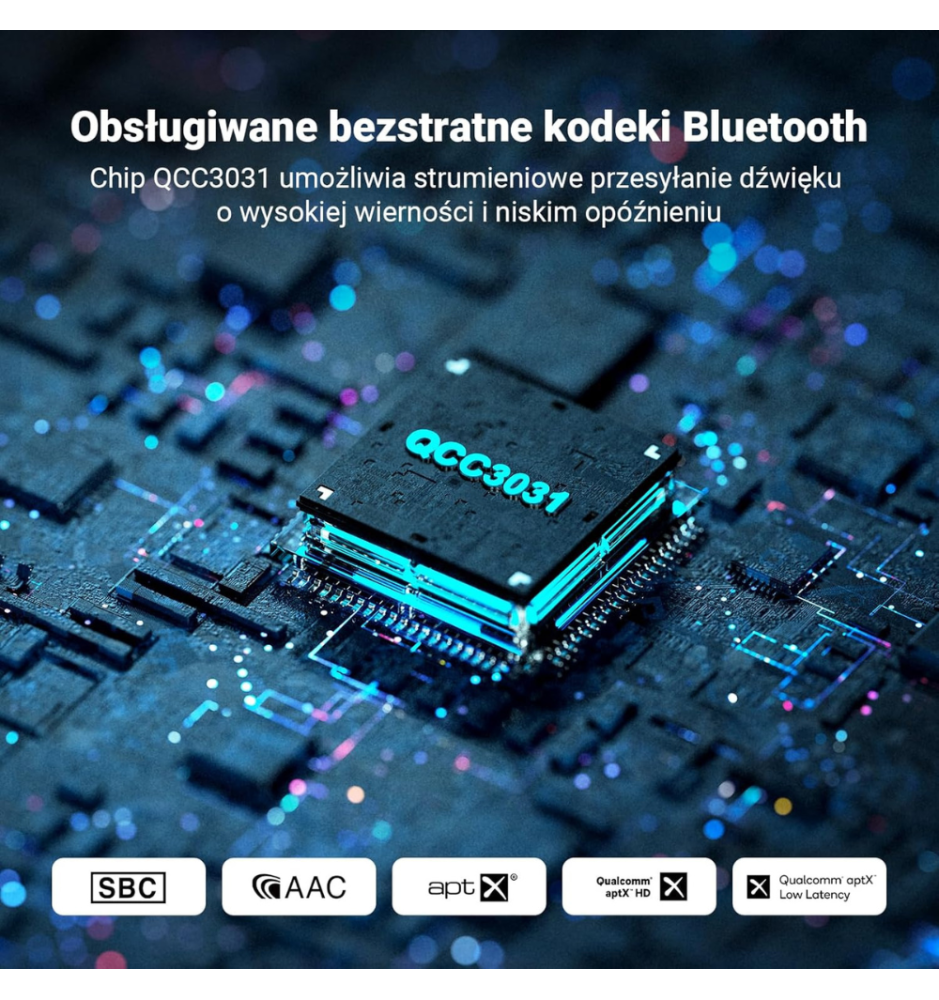 Dzięki modułowi QCC3031 GR40 oferuje transmisję Bluetooth z kodekami aptX, aptX-HD oraz aptX-LL. Zapewnia to czysty, dynamiczny dźwięk oraz bardzo niskie opóźnienia – idealne do filmów i gier.
