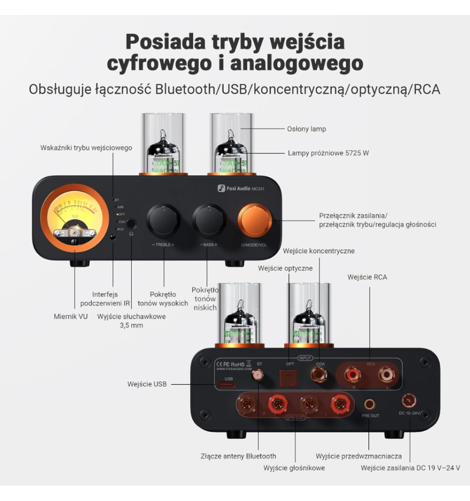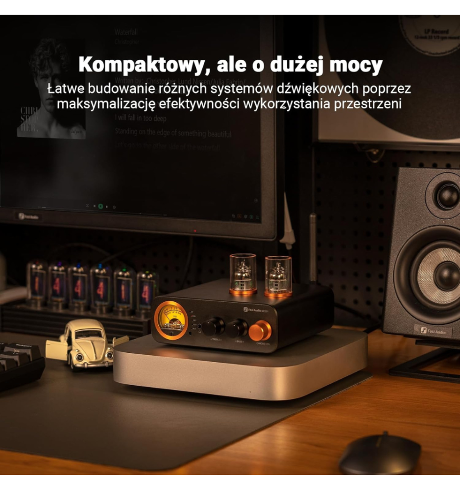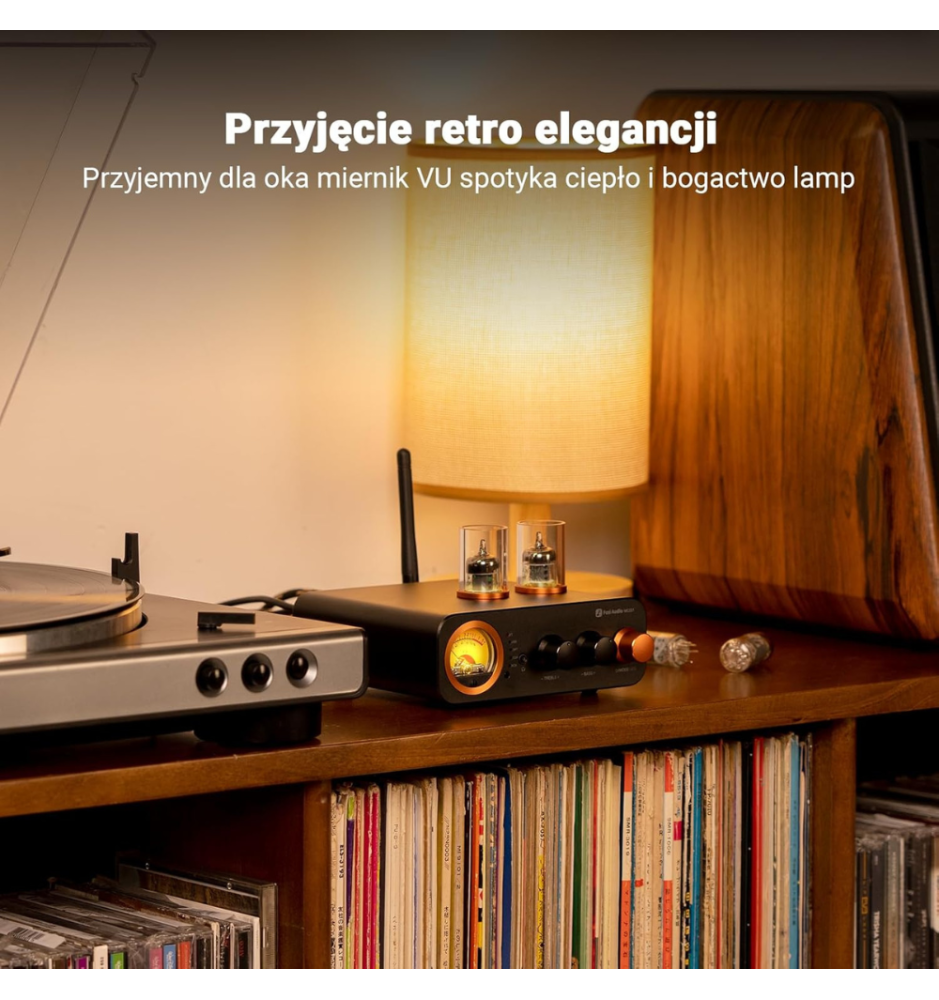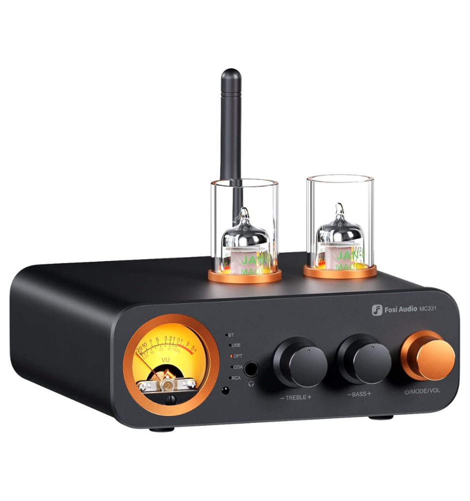 Fosi Audio MC331 to kompaktowy, lampowy DAC i wzmacniacz All-in-One z mocą 105W×2, wieloma wejściami (Bluetooth, USB, OPT, COA, RCA), VU meterem, pilotem i wyjściem słuchawkowym.