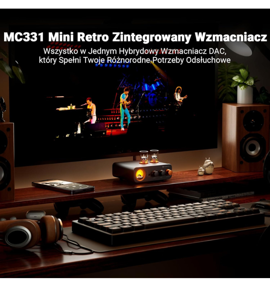 MC331 to kompaktowy, hybrydowy wzmacniacz z lampą i wbudowanym DAC-em — łączy ciepłe brzmienie lampowe z nowoczesnymi wejściami (Bluetooth, USB, optyczne, koaksjalne, RCA), pilotem oraz estetycznym wskaźnikiem VU. Idealny do zestawów półkowych i słuchawek, oferując moc do 105W ×2 @ 4Ω.