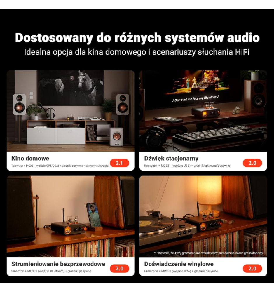 MC331 integruje DAC, przedwzmacniacz, wzmacniacz głośnikowy oraz stopień słuchawkowy w jednej, poręcznej obudowie. Dzięki temu podłączysz komputer, telefon, odtwarzacz CD czy gramofon (z wbudowanym preampem) bez dodatkowych urządzeń — zmiana źródeł odbywa się szybko i wygodnie za pomocą pilota.