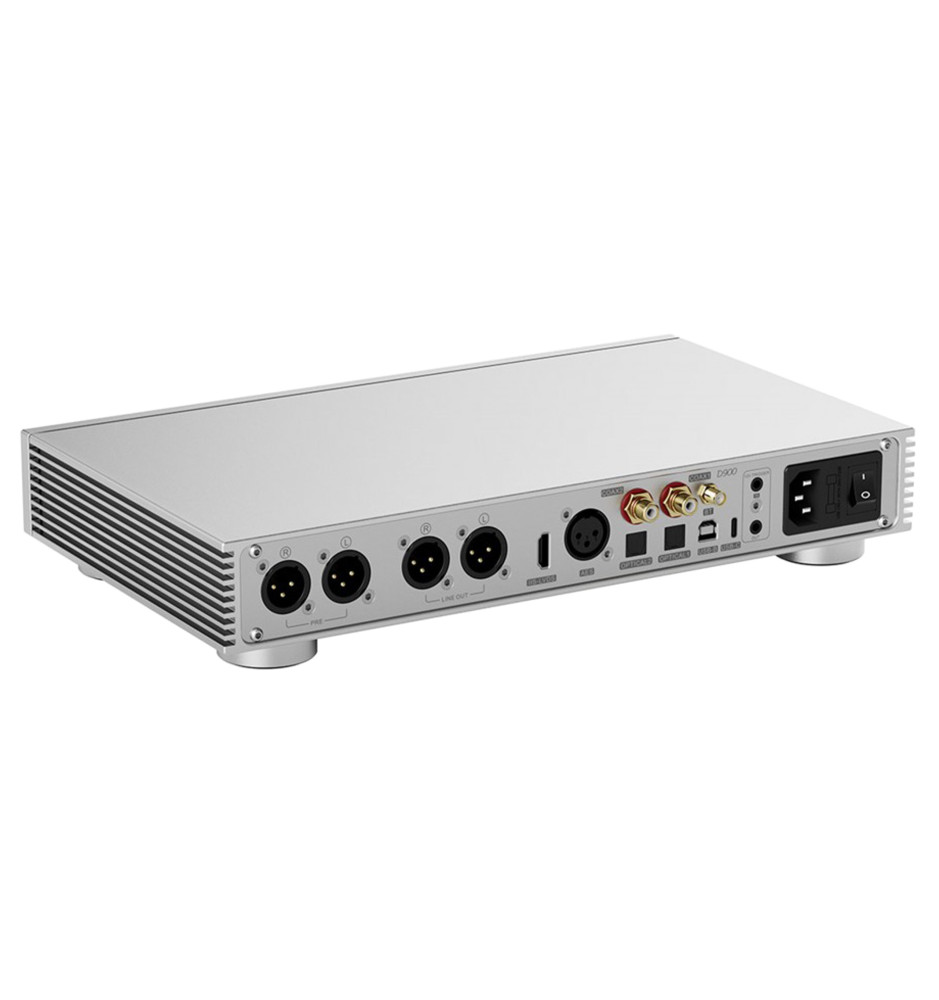 D900 wykorzystuje autorską, dyskretną architekturę PSRM i precyzyjny układ I/V, co przekłada się na zniekształcenia THD+N ≤ 0,000055% oraz SNR/DNR 131 dB – rekordowe parametry w kategorii hi‑endowych DAC‑ów. Urządzenie oferuje również funkcję przedwzmacniacza z regulowaną głośnością i pamięcią poziomu dla każdego wejścia. Niezależny układ przedwzmacniacza umożliwia bezpośrednie podłączenie wzmacniacza mocy lub aktywnych kolumn.