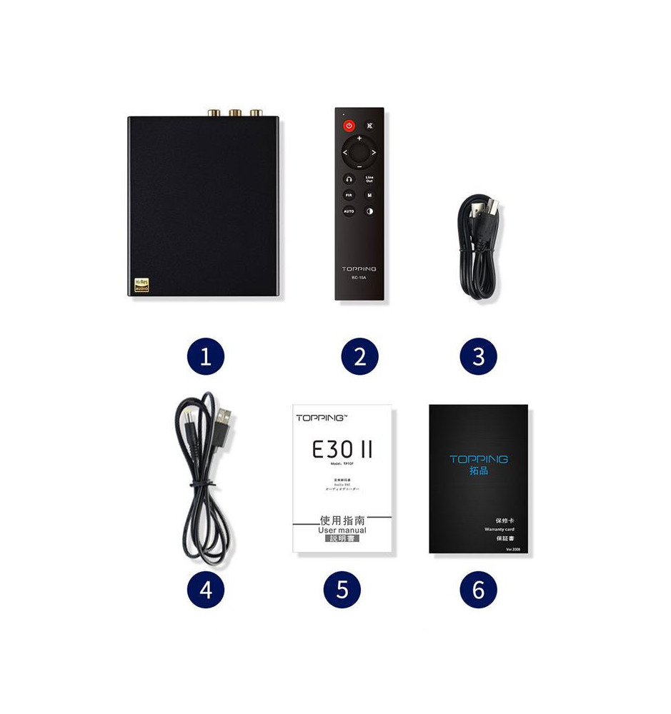 Topping E30 II posiada wejścia optyczne, koncentryczne i USB, dzięki czemu może być podłączony do wielu typów cyfrowego źródła dźwięku. Na wyjściu wyposażony został w popularnie stosowane analogowe złącze RCA. Na przednim panelu urządzenia znajduje się niewielki wyświetlacz z którego można odczytać podstawowe informacje. Do jego wygodnej obsługi służy dołączony pilot na podczerwień.
