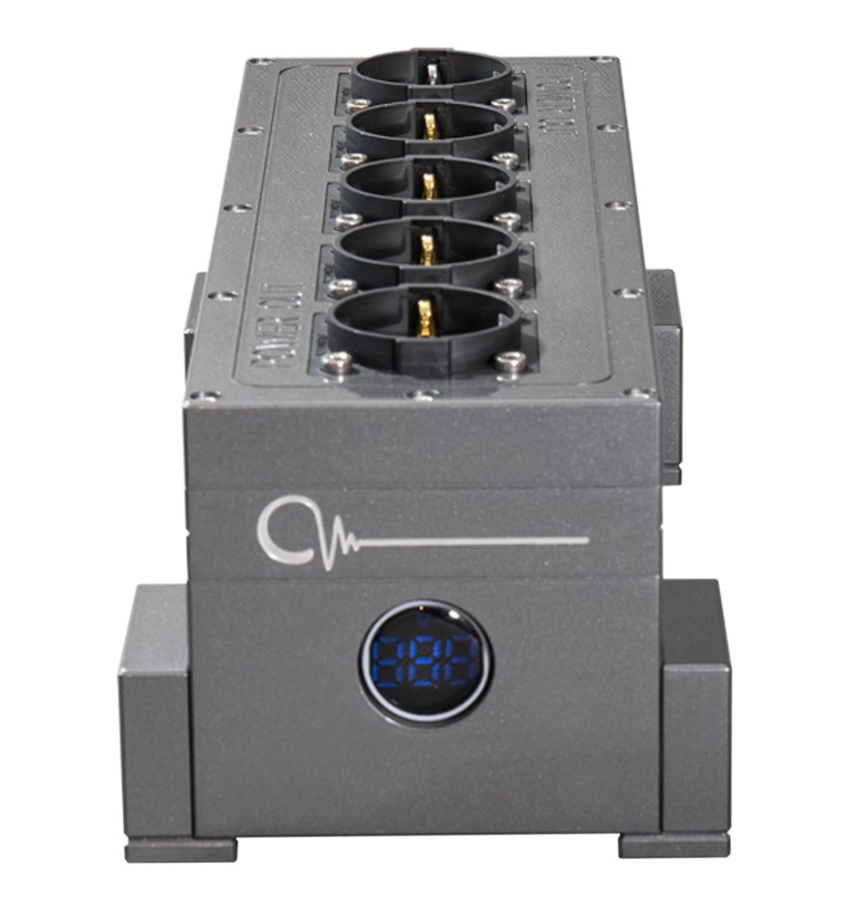 Najwyższej klasy kondycjoner zasilania z pięcioma gniazdami 230V schuko firmy Furutech Au/NCF, wyposażony w woltomierz i amperomierz, dedykowany do zasilania sprzętów Hi-End Audio.