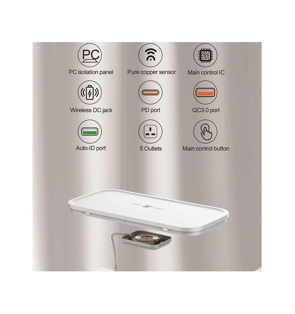 Uniwersalna listwa zasilająca będąca równocześnie organizerem do przewodów oraz bezprzewodową ładowarką. Pozwoli schludnie i sprawnie zarządzać przewodami przy urządzeniach, a 5 gniazd AC z 3 portami USB umożliwią podpięcie aż do 8 różnych urządzeń jednocześnie. Dołączony przewód o długości 2 metrów charakteryzuje się niską opornością i bezpieczniejszym przewodnictwem w porównaniu z kablami używanymi w standardowych listwach.