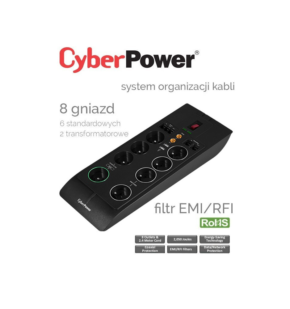 Wyłącznik mechaniczny został wzbogacony o diodę LED sygnalizującą działanie listwy. Listwa CyberPower to wygodny system organizacji kabli, dzięki któremu zapobiegniemy plątaninie przewodów zasilających.