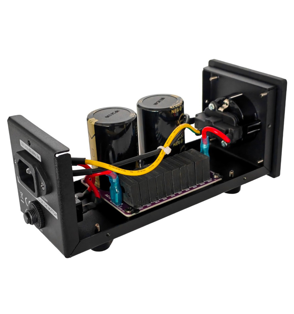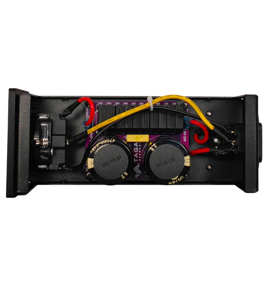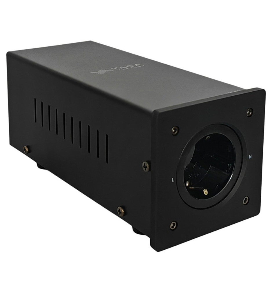 Filtr Taga Harmony DC-100, dzięki dziesięciu mostkom wysokoprądowym i wysokiej częstotliwości oraz dwóm kondensatorom 47000uF, zapewnia silne blokowanie przychodzącego prądu stałego do 12V bez negatywnego wpływu na jakość dźwięku. Zastosowane gniazdo zasilania IEC C14 pozwala na wymianę dołączonego przewodu zasilającego Schuko-IEC C13 w razie uszkodzenia lub w celu zastosowania przewodu wyższej klasy.