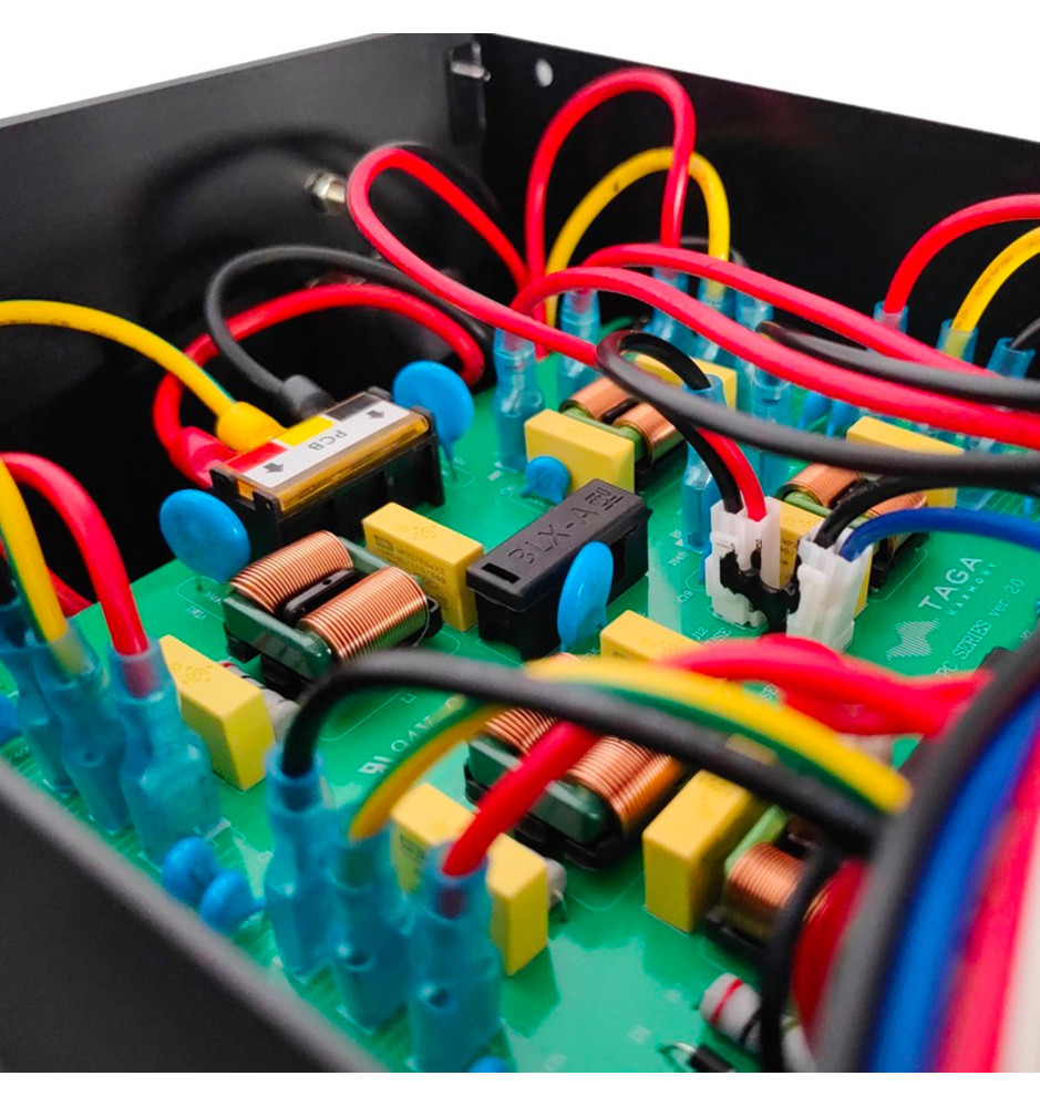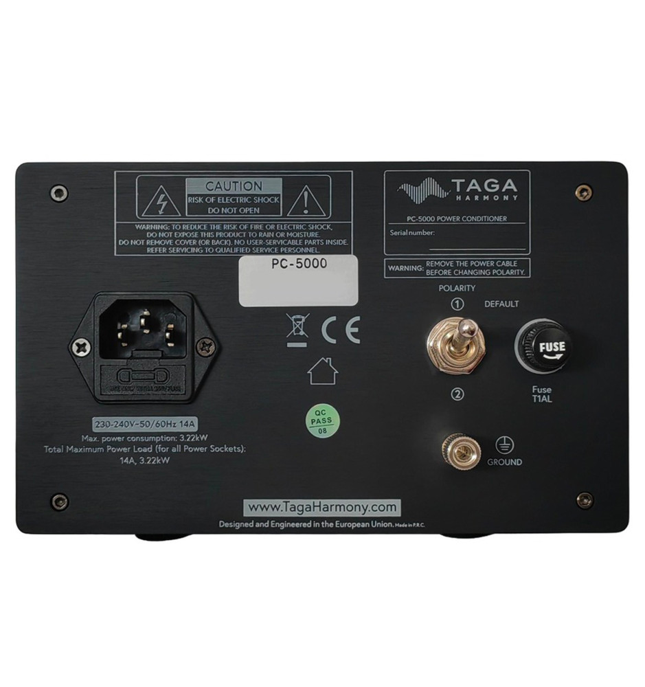 Kondycjoner sieciowy Taga Harmony PC-5000 (2025) został wyposażony w niezależne grupy przełączalnych i nieprzełączalnych gniazd zasilania 230-240 V typu Schuko z niezależnymi filtrami chroniącymi przed zakłóceniami, zaprojektowanymi specjalnie do użytku z konkretnym sprzętem audio i wideo. Dla każdej z 4 grup gniazd zastosowano oddzielne cewki indukcyjne z miedzi beztlenowej.