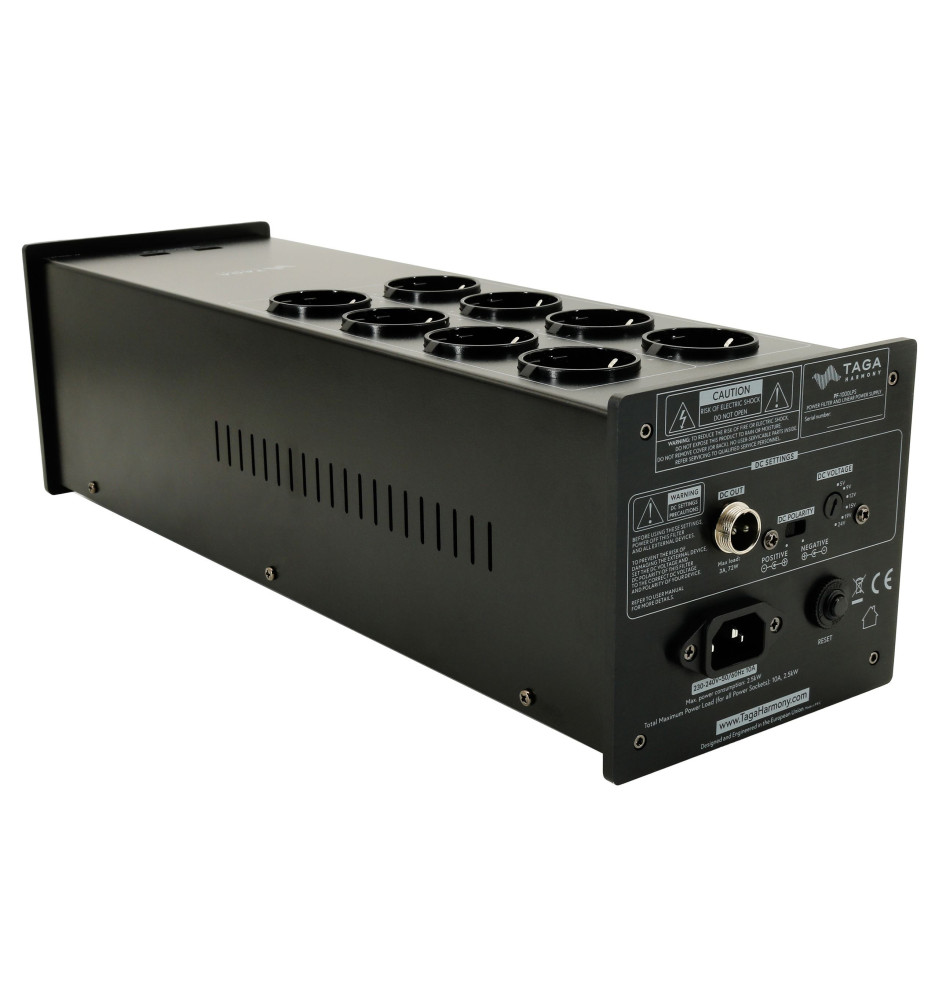 Taga Harmony PF-1000LPS oferuje możliwość wyboru napięcia wyjściowego DC oraz posiada zabezpieczenia przeciążeniowe i przeciwprądowe dla wszystkich wyjść. Dodatkowo posiada detektor fazy, wskaźnik napięcia i możliwość zmiany polaryzacji dla wyjścia DC. Wskaźnik napięcia na przednim panelu pomaga kontrolować stabilność napięcia w gniazdku ściennym.