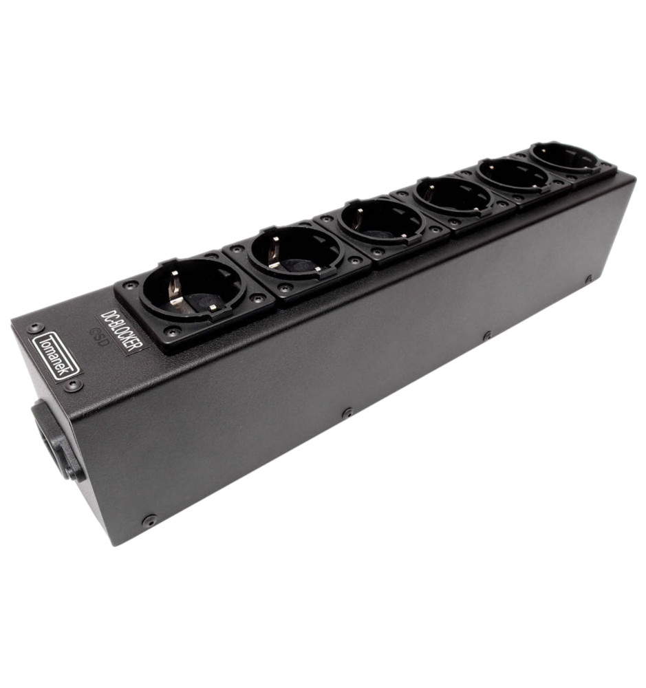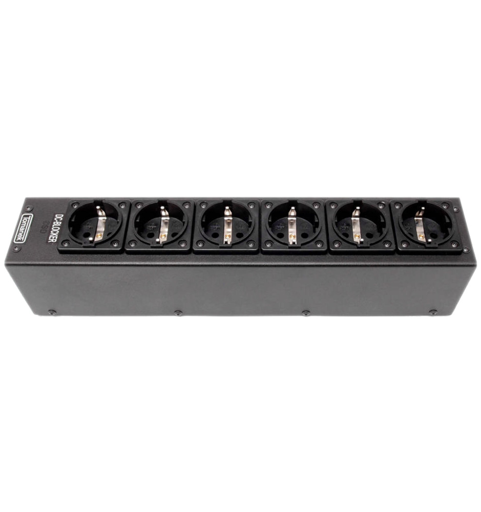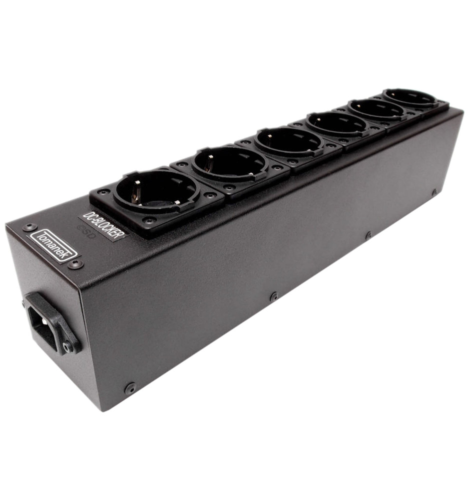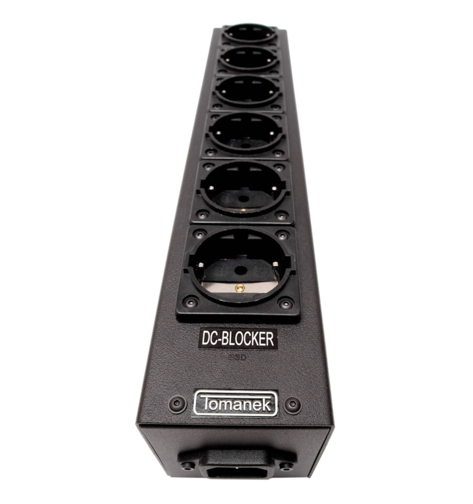 Na listwie Tomanek TAP6S+ znajduje się jedno gniazdo z układem DC Blocker przeznaczone do eliminacji składowej stałej napięcia zasilającego 230V, która jest pospolitym zjawiskiem w domowej sieci elektrycznej, tworzona przez zasilacze impulsowe w urządzeniach AGD/RTV (pralka automatyczna, ładowarka do telefonu itp.) oraz przez przetwornice.