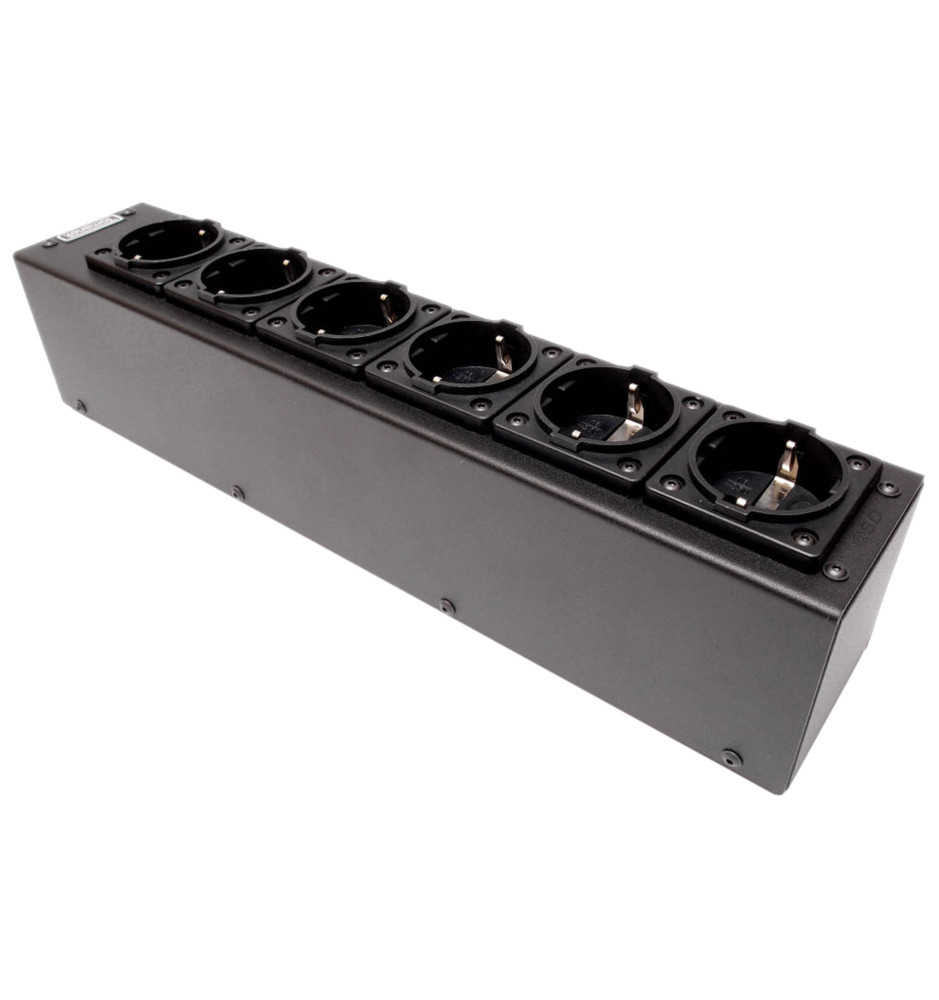 6-gniazdowa listwa zasilająca z filtrami Schaffnera i gniazdem wejściowym typu IEC, przeznaczona do urządzeń audio, gwarantująca wysoką skuteczność tłumienia zakłóceń oraz sprawdzająca się przy dużym obciążeniu prądowym.