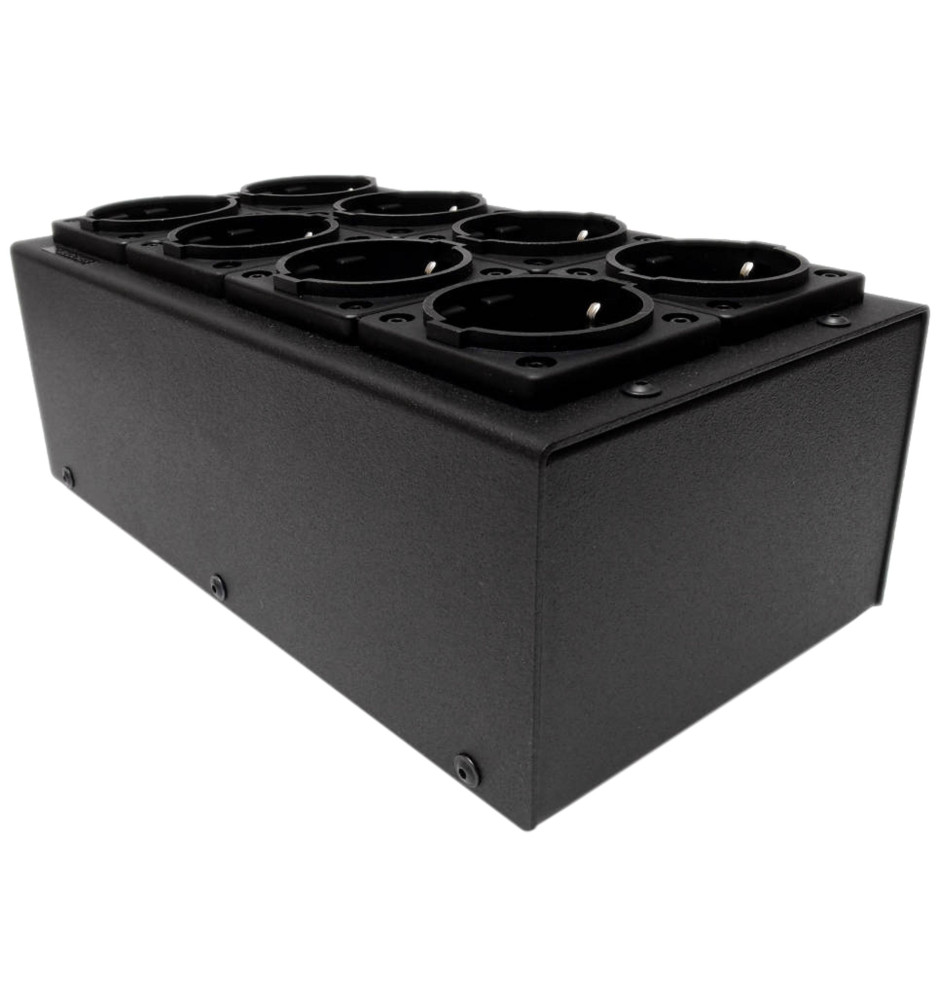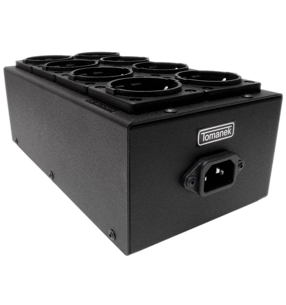 Audiofilska listwa zasilająca Tomanek TAP8 wyposażona w 6 gniazd z filtrami Schaffera oraz 2 gniazda z blockerami DC, zapewniająca eliminację zakłóceń oraz zwiększająca wytrzymałość przy dużym obciążeniu prądowym, dzięki czemu listwa idealnie nadaje się do domowych systemów audio.