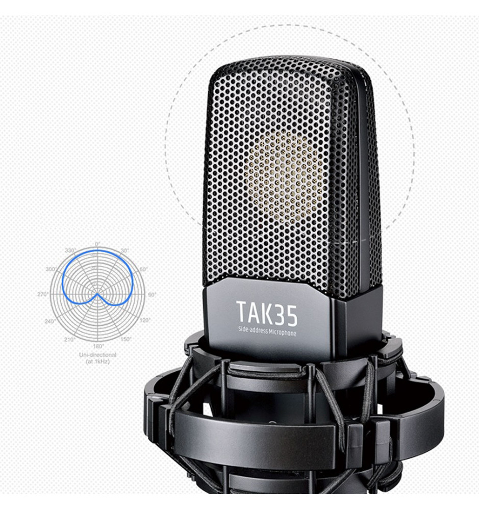 Kardioidalna budowa mikrofonu na którą zdecydował się TAKSTAR, zapewnia bardzo precyzyjne przechwytywanie pożądanego dźwięku przy jednoczesnej eliminacji szumu i hałasów z otoczenia. TAK35 zapewnia odpowiednie pasmo przenoszenia, dlatego znakomicie nadaje się nie tylko do nagrywania wokali, sprawdzi się również, do nagrywania instrumentów. Oferuje mocne basy, klarowną średnicę oraz detaliczną górę.