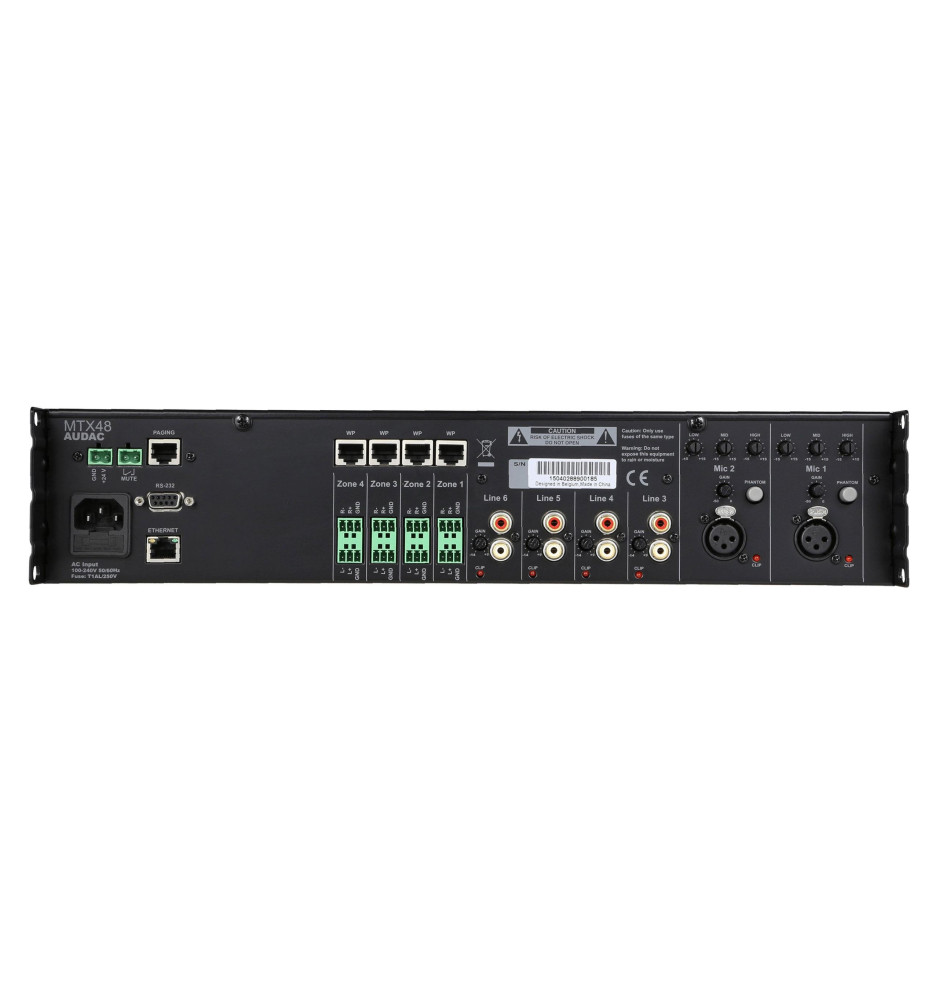 Urządzenie zostało zaopatrzone w szereg przydatnych złączy, które pozwalają zintegrować je z wieloma różnymi systemami audio, zarówno domowymi, jak i tymi wykorzystywanymi w użytku komercyjnym. Zbalansowane wyjścia symetryczne wykorzystują 3-pinową magistralę Euro uzupełnioną o złącze RJ45 dla każdego z wyjść. W mikserze Audac MTX48 pomyślano także o możliwości podłączenia zasilania awaryjnego 24 V w przypadku jakichkolwiek przerw w dostawie energii elektrycznej.