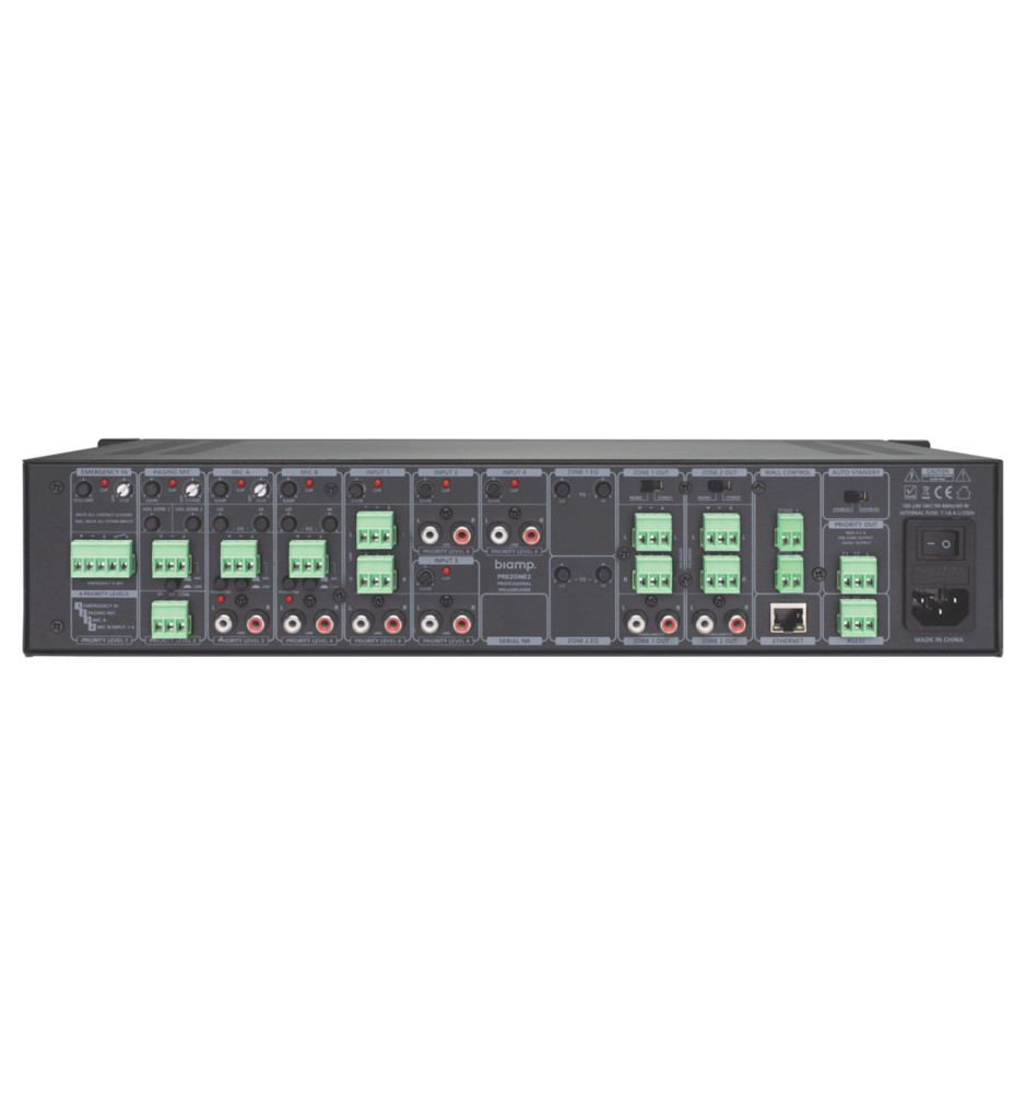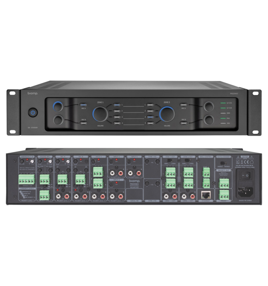 PREZONE2 jest wyposażony w cztery poziomy priorytetów dystrybucji dźwięku: jedno wejście alarmowe, jedno wejście przywoławcze, dwa wejścia mikrofonowe i cztery wejścia liniowe stereo. Każdy kanał wyjściowy jest wyposażony w niezależny przełącznik mono/stereo na panelu tylnym. Urządzenie obsługuje również sterowanie za pośrednictwem przeglądarki, RS-232 lub paneli ściennych.