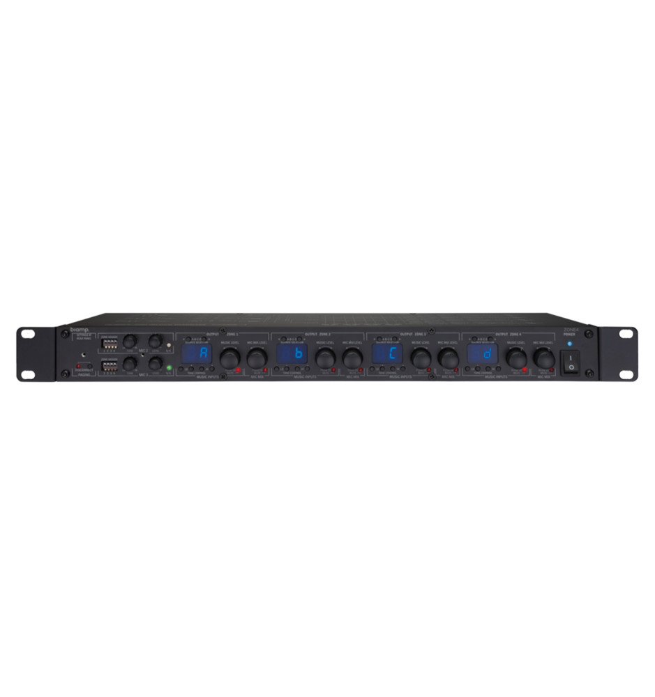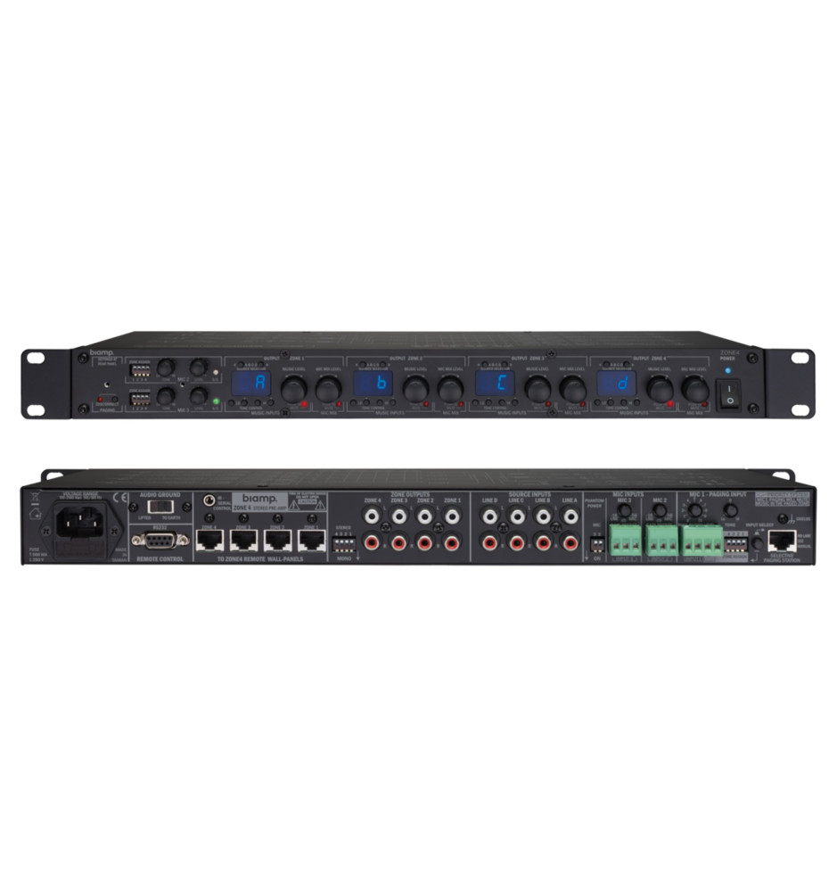 Zaawansowany przedwzmacniacz Biamp ZONE4 umożliwiający sterowanie czterema strefami stereo. Urządzenie zostało wyposażone w wejścia dla czterech osobnych źródeł muzyki oraz możliwość przypisania do trzech mikrofonów na strefę. Każdy sygnał można przypisać do dowolnej z czterech stref wyjściowych za pomocą przełączników DIP, a dodatkowo dla wejść mikrofonowych MIC 1 i 2 przedwzmacniacz ZONE4 oferuje zasilanie Phantom