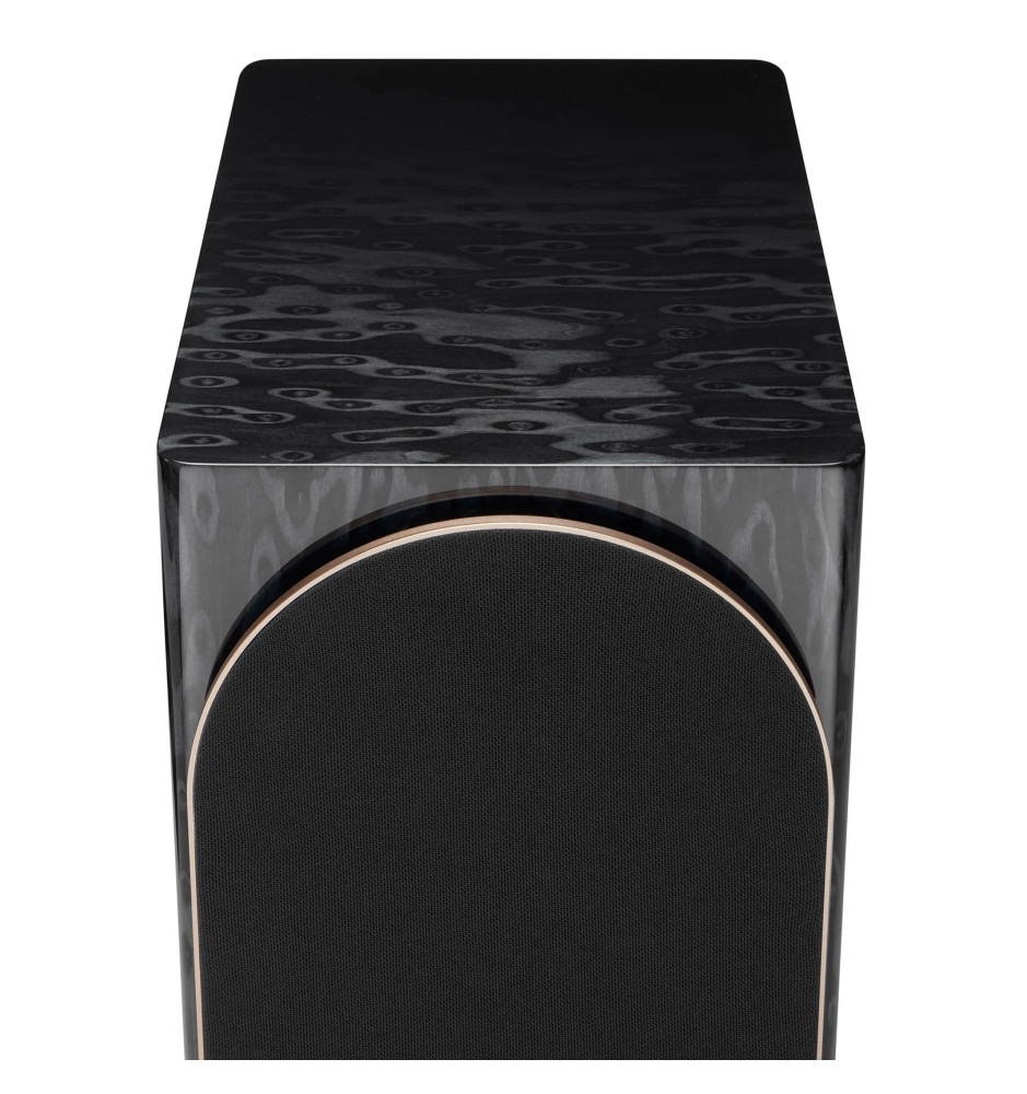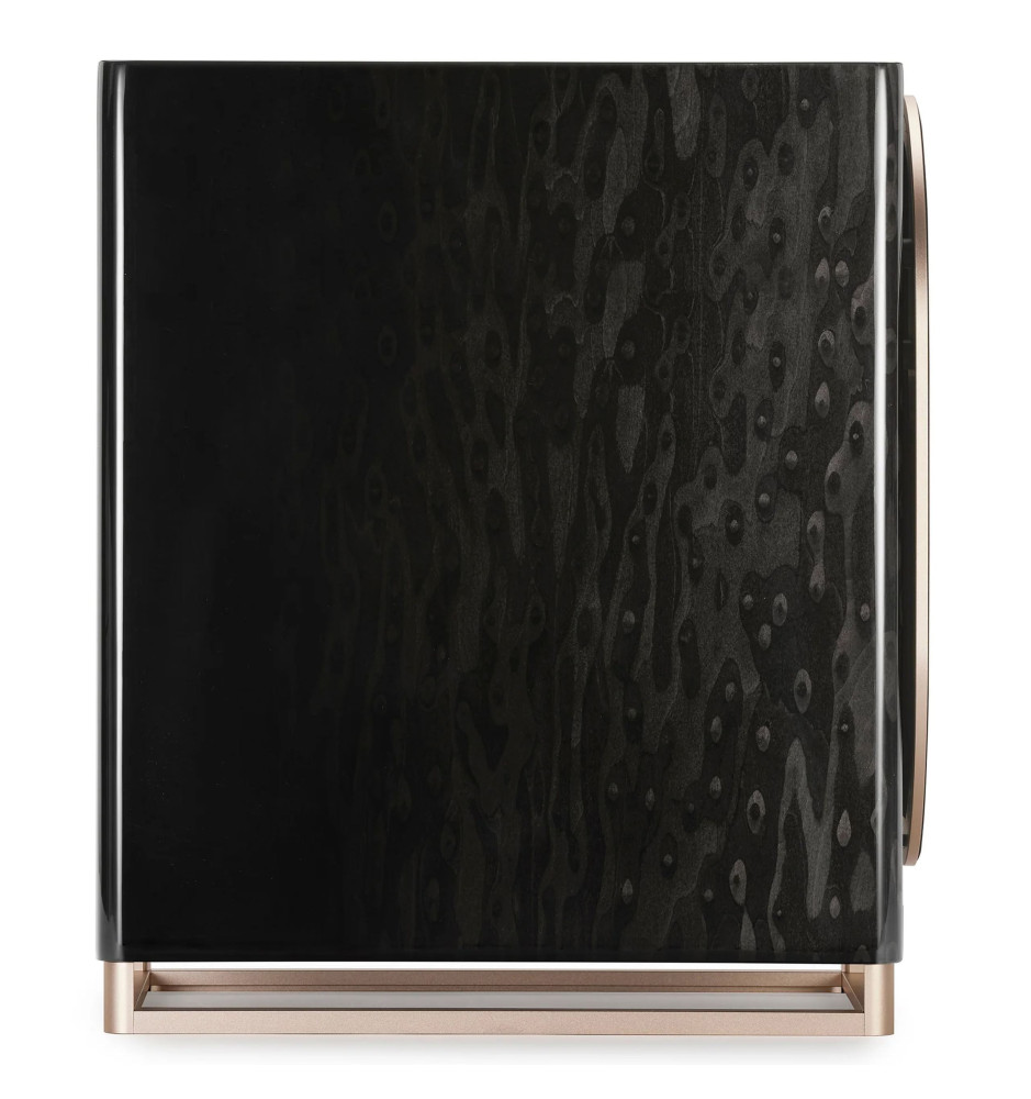 Staranne wykończenie głośników z zakrzywionymi krawędziami, detalami z anodyzowanego aluminium w kolorze szampana oraz naturalnym fornirem z orzecha włoskiego pokrytego błyszczącym lakierem, nadaje im prawdziwie luksusowy wygląd.