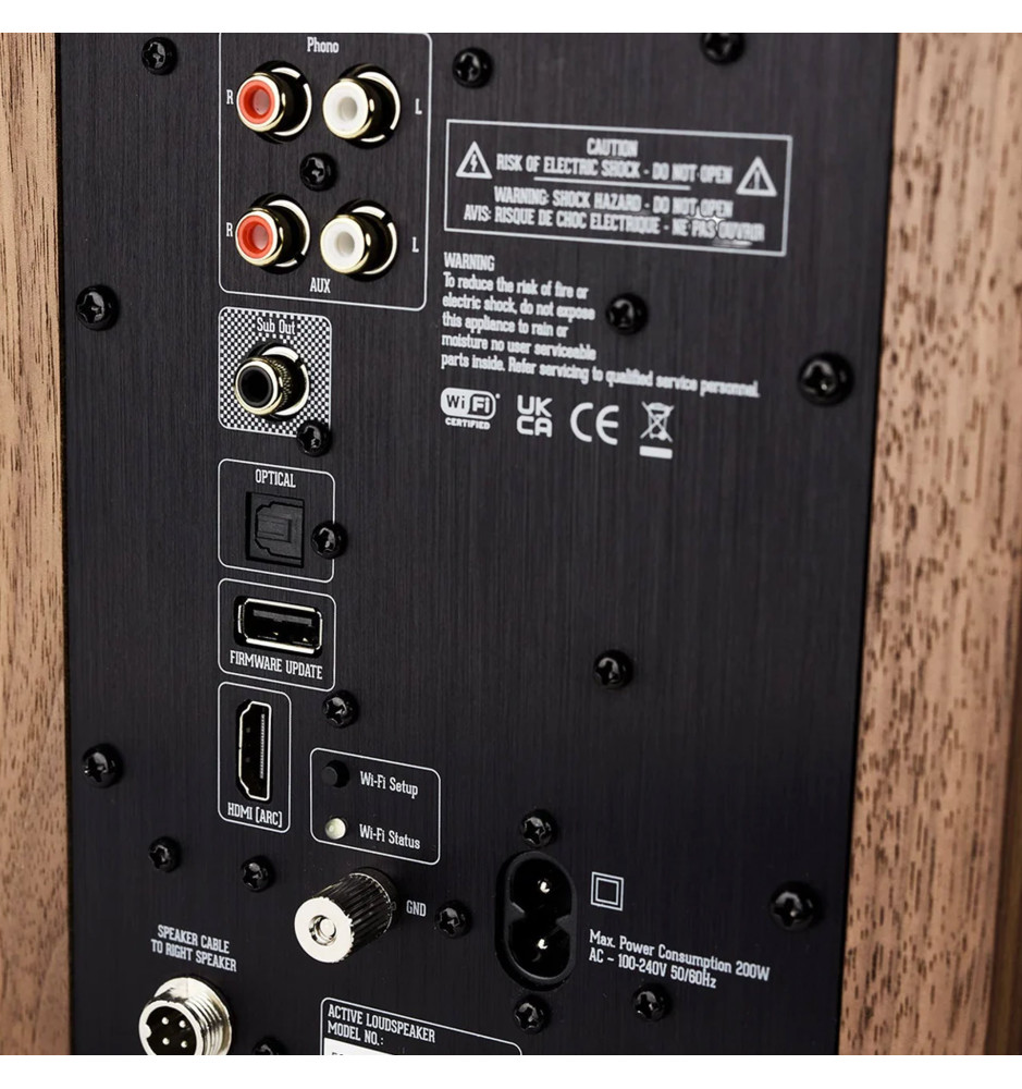 Forte A5 WiFi oferuje szeroką gamę złączy: HDMI ARC do podłączenia telewizora (z automatycznym włączaniem i sterowaniem pilotem TV), optyczne wejście cyfrowe, analogowe RCA, wejście gramofonowe (MM) oraz wyjście dla subwoofera. Dzięki temu z łatwością podłączysz telewizor, odtwarzacz CD, gramofon lub inne źródła dźwięku. To naprawdę uniwersalne kolumny do każdego rodzaju setupu.