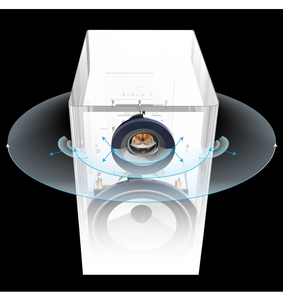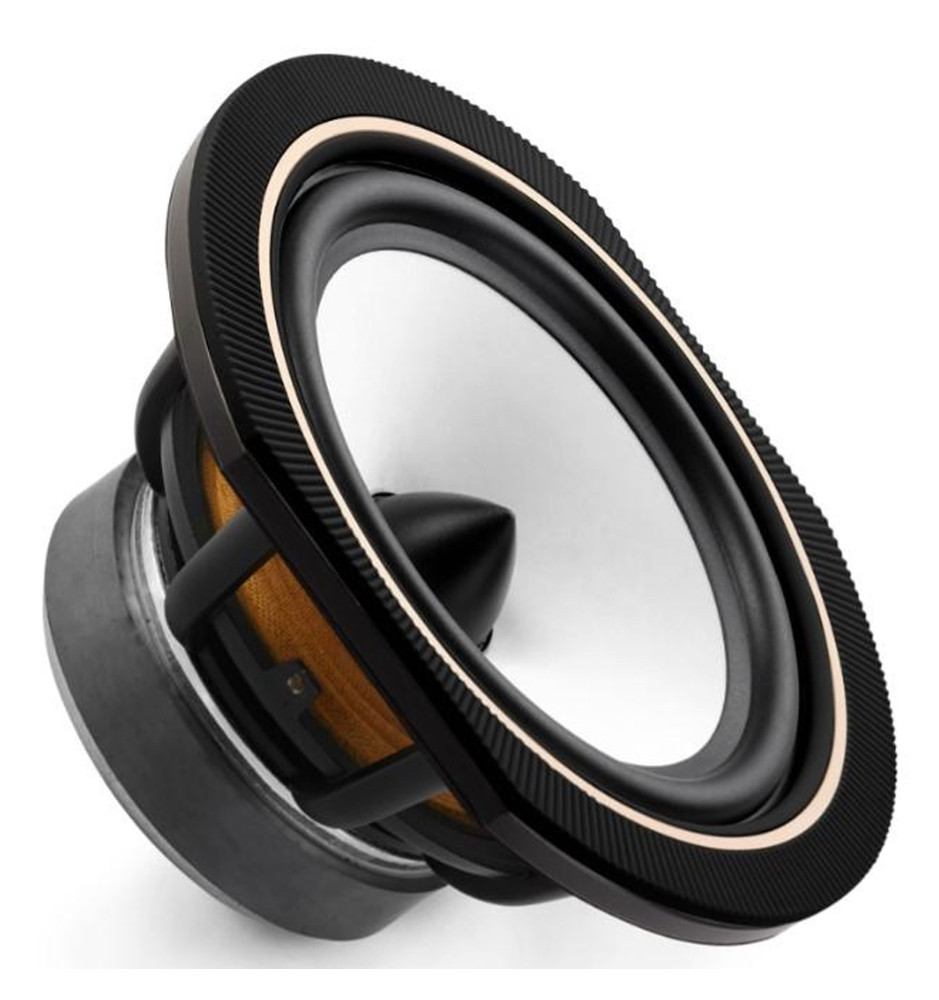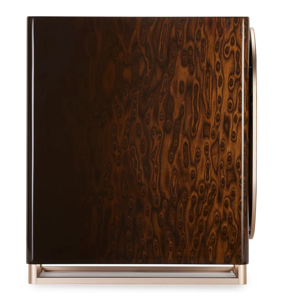 Staranne wykończenie głośników z zakrzywionymi krawędziami, detalami z anodyzowanego aluminium w kolorze szampana oraz naturalnym fornirem z orzecha włoskiego pokrytego błyszczącym lakierem, nadaje im prawdziwie luksusowy wygląd.