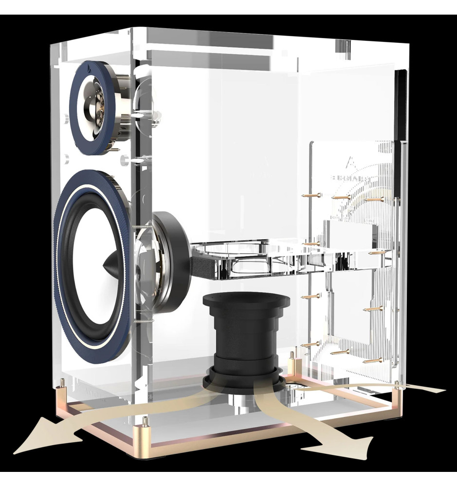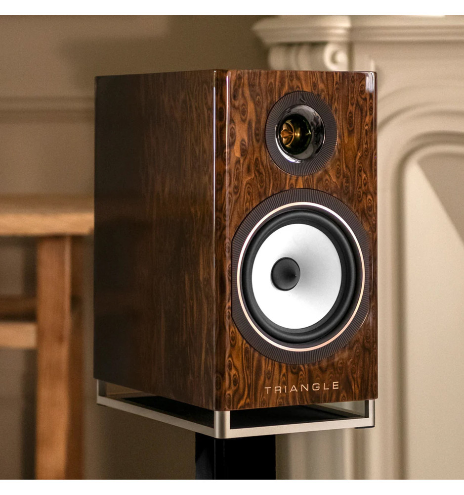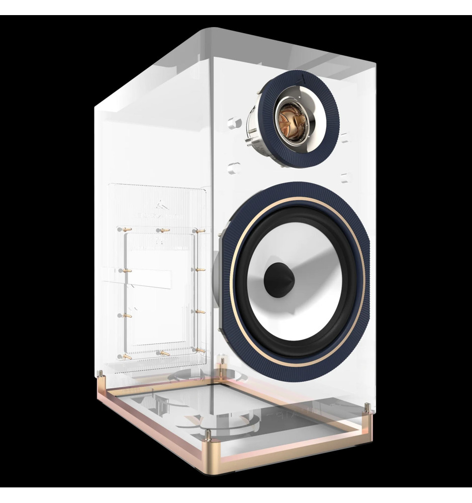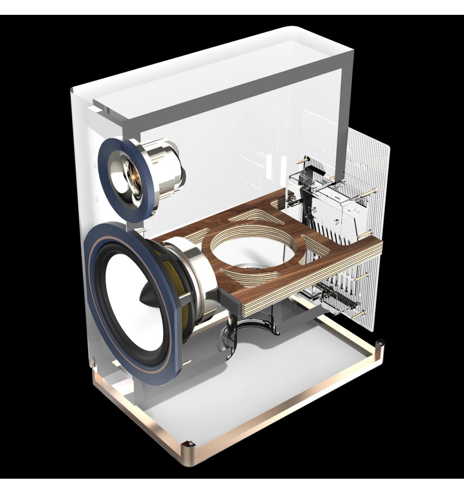 Staranne wykończenie głośników z zakrzywionymi krawędziami, detalami z anodyzowanego aluminium w kolorze szampana oraz naturalnym fornirem z orzecha włoskiego pokrytego błyszczącym lakierem, nadaje im prawdziwie luksusowy wygląd.