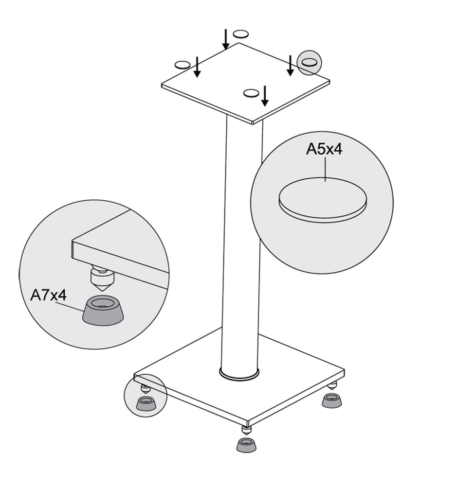 Podstawki głośnikowe TSS-96G firmy TAGA Harmony, dzięki zamontowanym dodatkowym gumkom w górnej płycie oraz stabilnym, dużym kolcom świetnie izolują głośniki od podłoża, wpływając na poprawę jakości dźwięku.