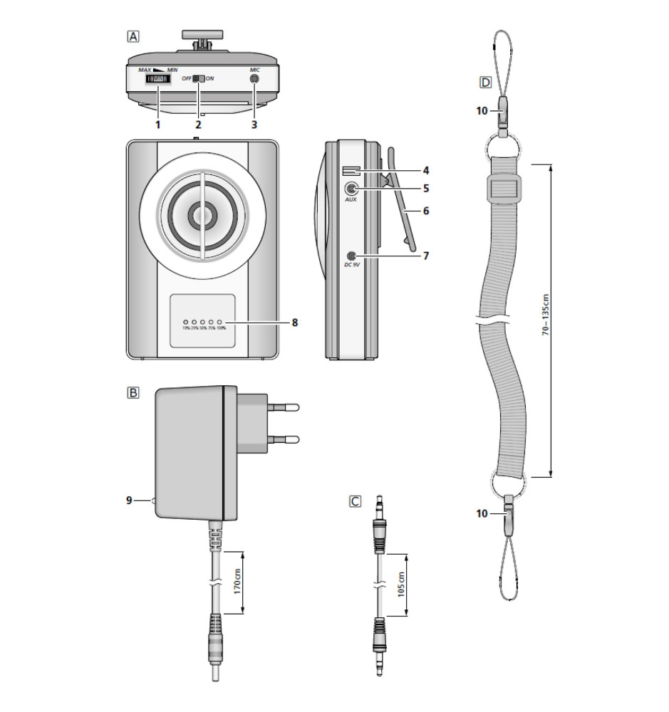 Zestaw WAP-8 zawiera: elektretowy mikrofon nagłowny, elektretowy mikrofon doręczny, cyfrowy wzmacniacz głosu z wbudowanym głośnikiem, zasilacz, kabel audio ze złączami 3.5mm, pasek na szyję oraz instrukcję obsługi.