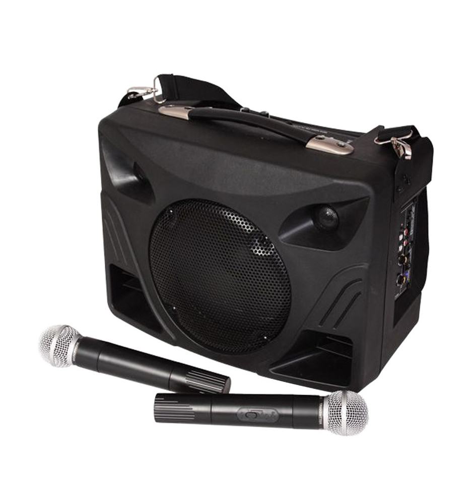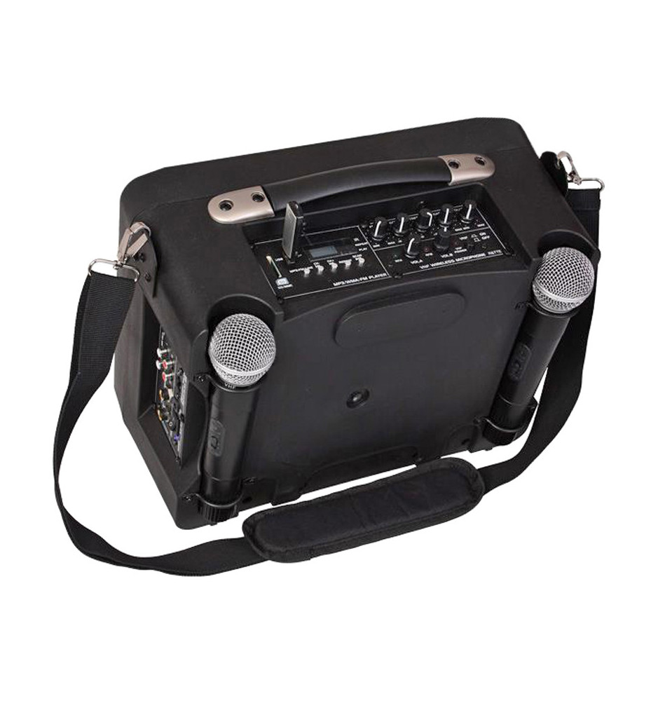 Zestaw przenośny zapewnia regulację equalizera, echa, kontrolę głośności muzyki i mikrofonów oraz wyposażono go w wejścia USB, LINE IN oraz gniazdo kart SD. Całość dopełnia tuner FM oraz odtwarzacz MP3, które sprawiają, że jest to kompletny zestaw, sprawdzający się w każdych warunkach.