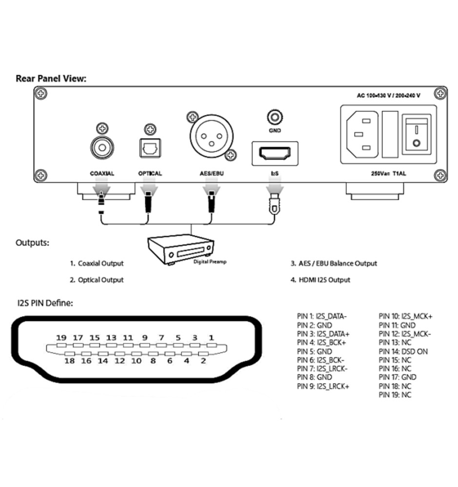 Transport CD NuPrime CDT-10 posiada wyjścia cyfrowe koaksjalne, optyczne, AES/EBU oraz HDMI I2S. Dla wyjścia optycznego umożliwia sampling do 192 kHz i DoP64, dla wyjścia koaksjalnego do 768 kHz i DoP256, dla wyjścia HDMI I2S do 768 kHz i DoP256 oraz dla wyjścia zbalansowanego AES/EBU do 768 kHz i DoP256.