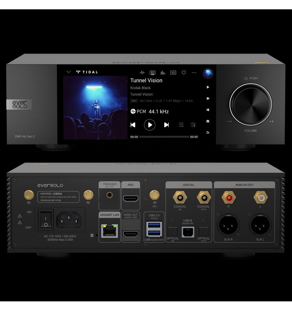Odtwarzacz oferuje wbudowany moduł Wi-Fi oraz Bluetooth 5.0 z obsługą kodeków SBC i AAC, co pozwala na strumieniowanie muzyki w wysokiej jakości, co potwierdza certyfikat Hi-Res Audio. Dzięki wsparciu dla popularnych usług takich jak TIDAL, Spotify i Qobuz, EverSolo DMP-A6 Gen 2 umożliwia łatwy dostęp do milionów utworów z całego świata.