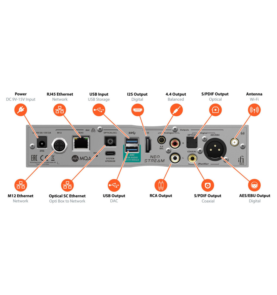 NEO Stream, oprócz łączności Wi-Fi, oferuje przewodowe połączenie z siecią za pomocą portów RJ45, M12 oraz optycznego LAN, będącego własną technologią iFi Audio. W zestawie znajduje się nadajnik OptiBox, który można podłączyć do routera, aby wykorzystać optyczne połączenie z odtwarzaczem NEO Stream. Zapewnia on ultra-szybkie przesyłanie do 10Gb/s oraz praktycznie zerową degradację sygnału.