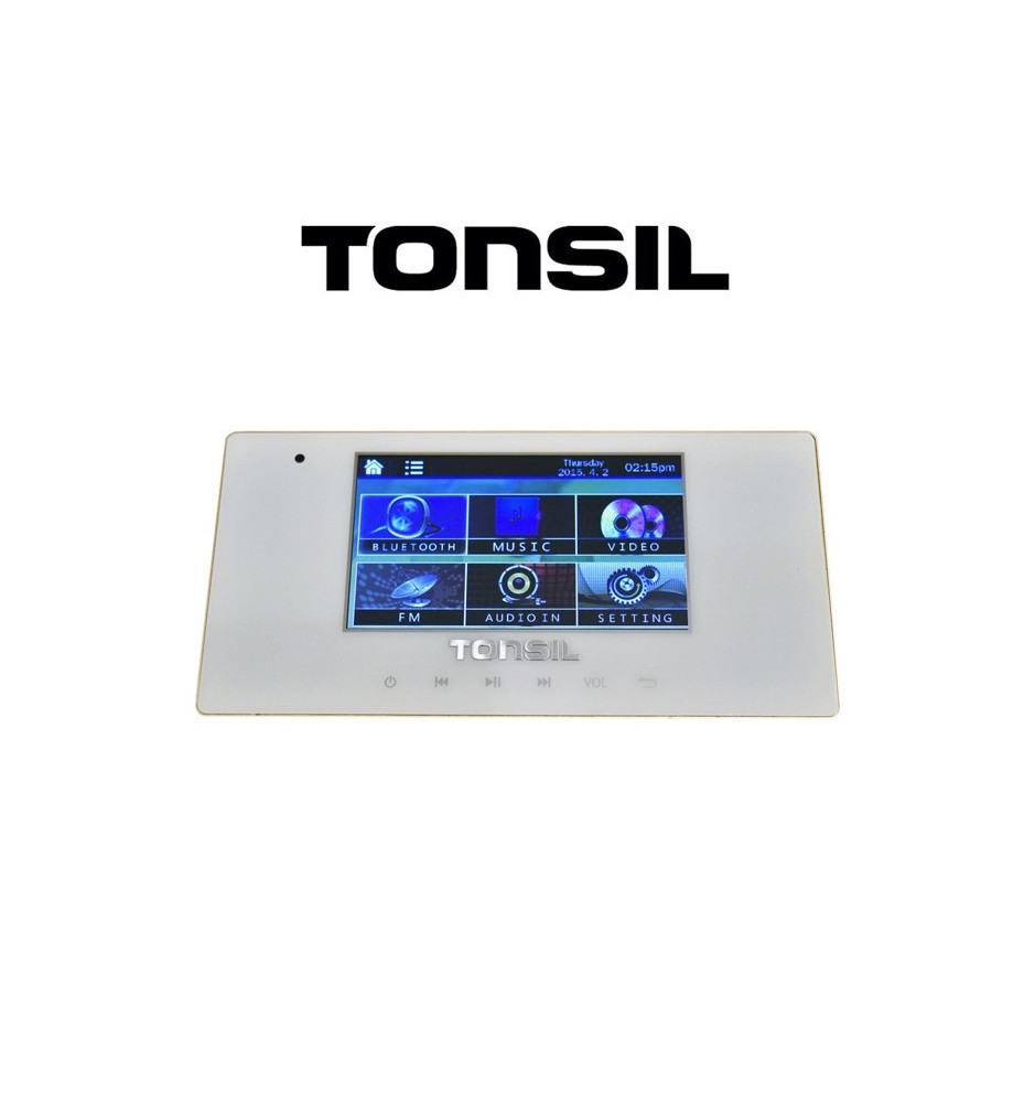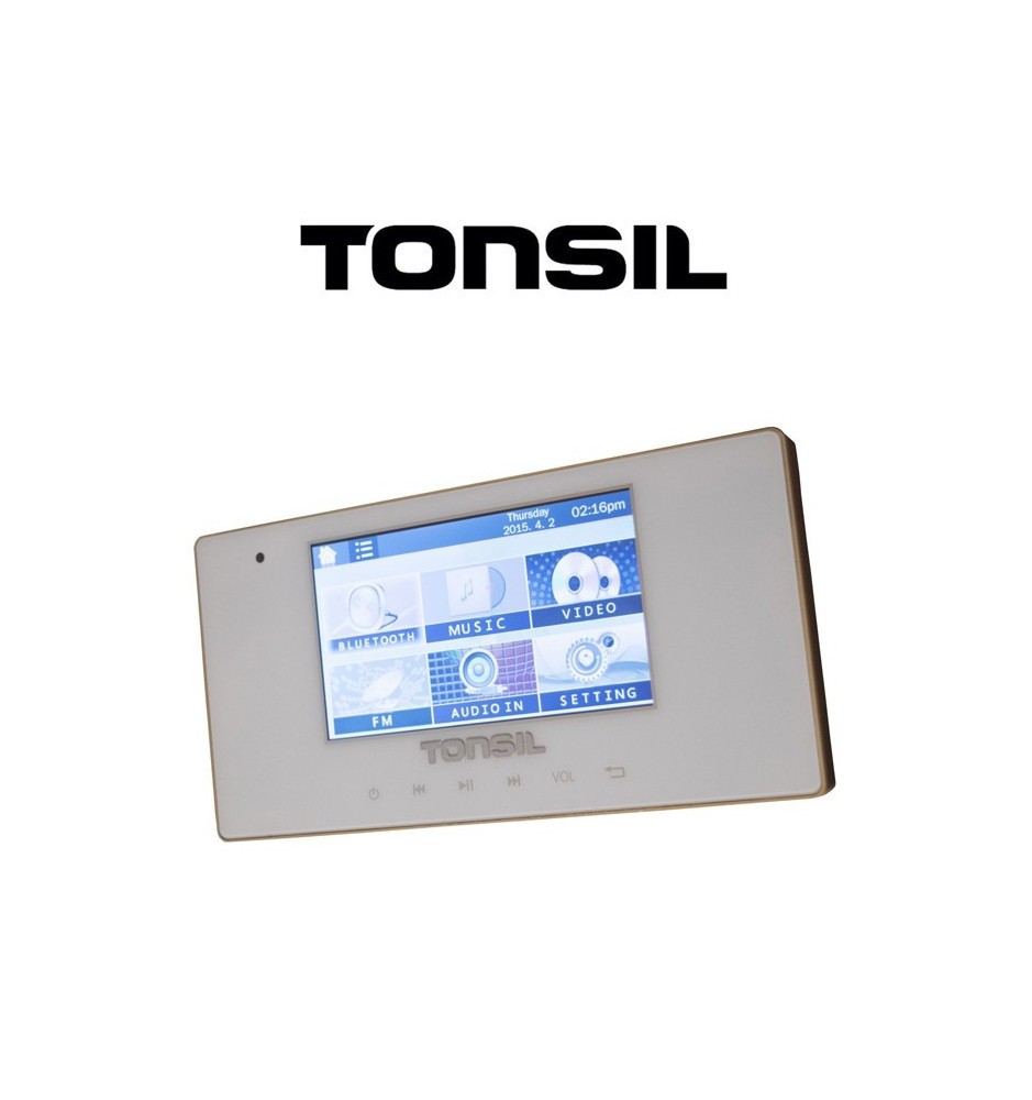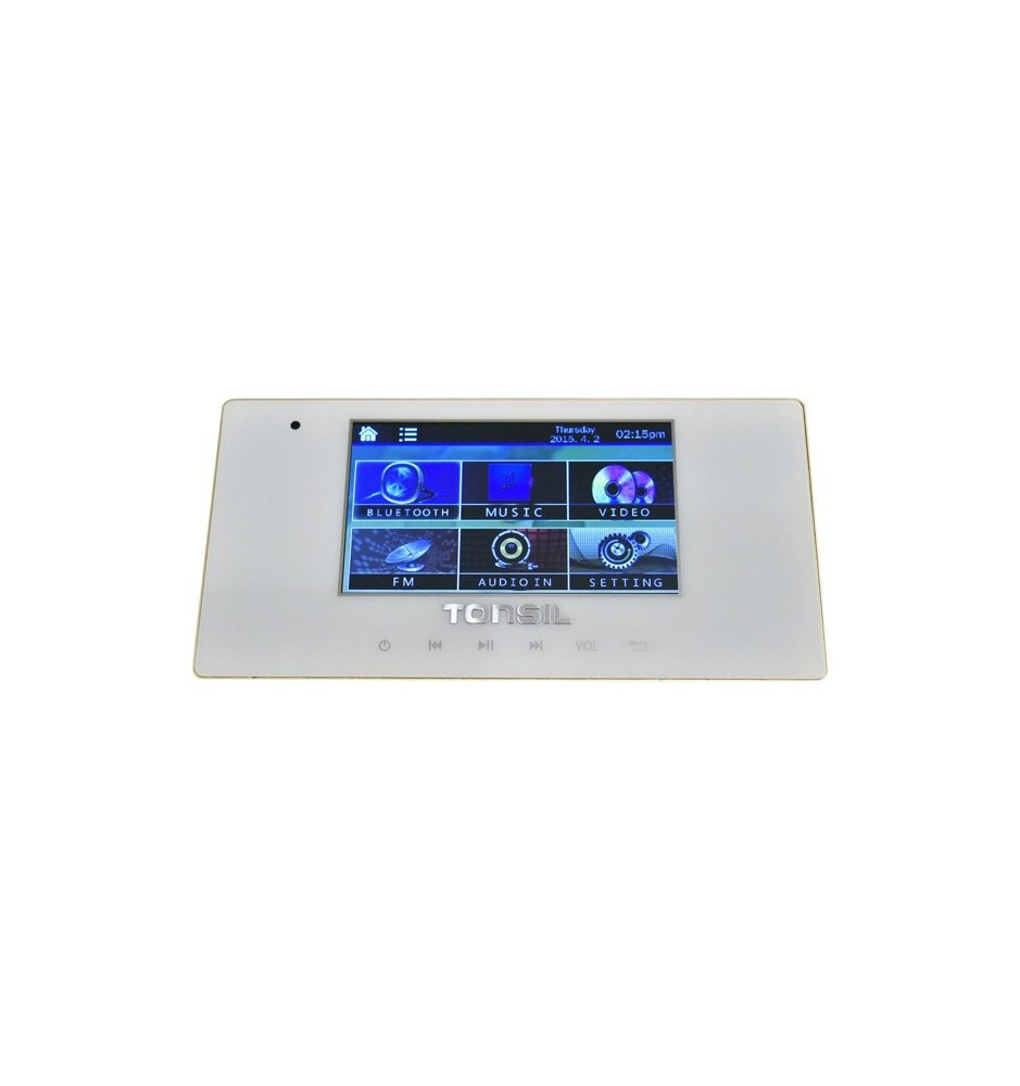 Odtwarzacz ścienny Tonsil WS-40 z kolorowym wyświetlaczem o przekątnej 4,3" oraz wzmacniaczem 4 x 20 W wyposażony w port USB, SD, technologię Bluetooth oraz radio FM.