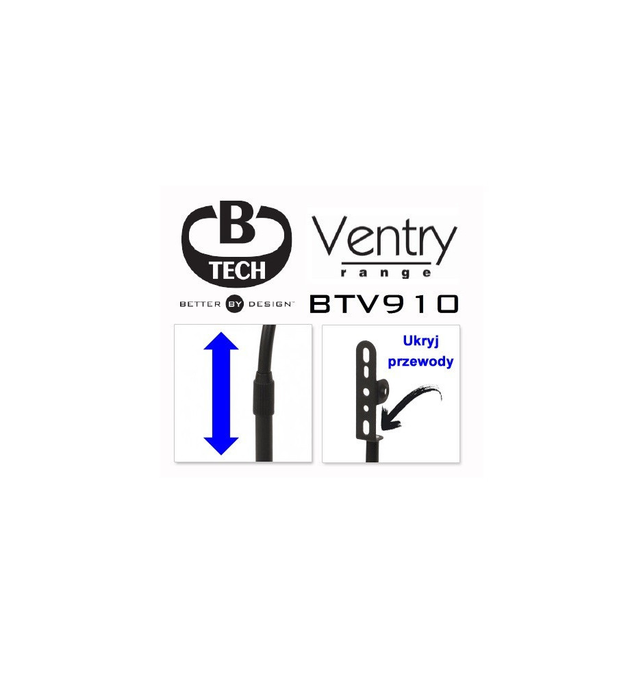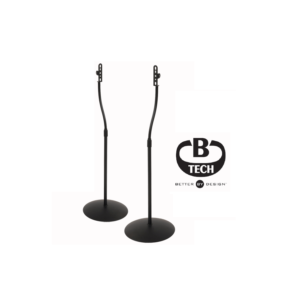 B-Tech BTV910 to specjalistyczne podstawki pod małe głośniki dla bardzo wymagających miłośników dobrego brzmienia brzmienia. Szczególnie polecane do głośników satelitek zestawów kina domowego. Przez górną, pustą część podstawy można przeprowadzić przewody głośnikowe aby poprawić wygląd zestawu. Wysokość podstawek może być ustawiona na 68,5 do 106 cm dzięki rozsuwanej pionowej rurze.