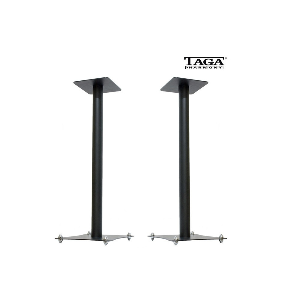 W zestawie znajdują się 2 sztuki podstawek pod głośniki firmy TAGA Harmony, które wyposażone są w solidne, srebrne kolce oraz posiadają w filarze podstawki kanał umożliwiający schowanie kabli głośnikowych.