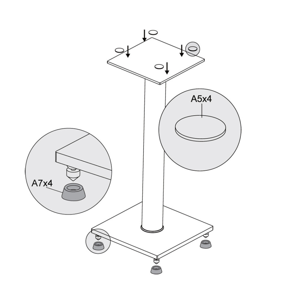 W zestawie komplet 2 sztuk podstawek pod głośniki, wyposażonych w solidne, srebrne kolce oraz kanał umożliwiający schowanie kabli głośnikowych.