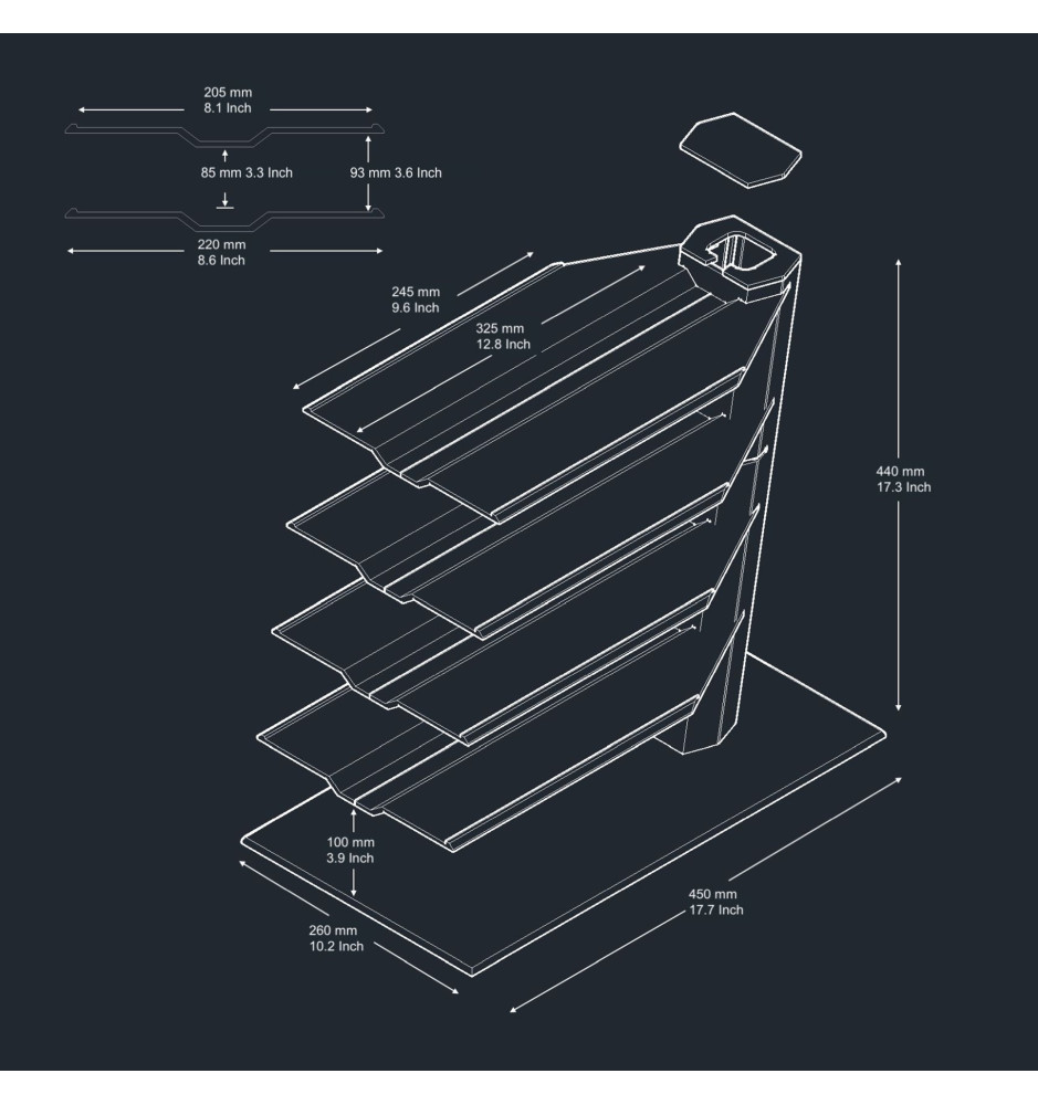 Dzięki czterem poziomom półek, Mothership 02 pozwala wygodnie ustawić cztery urządzenia audio (np. DAC + wzmacniacz + streamer + wzmacniacz słuchawkowy etc.), co pozwala zaoszczędzić miejsce na biurku lub stoliku. Stojak posiada wbudowaną kolumnę nośną z ukrytym systemem prowadzenia kabli, dzięki czemu przewody nie szpecą przestrzeni. To rozwiązanie sprawia, że cały zestaw wygląda schludnie i elegancko.