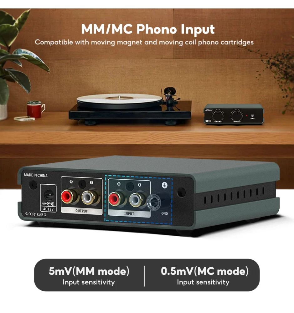 Urządzenie obsługuje zarówno wkładki MM, jak i MC, oferując poziomy wyjściowe: 5 mV (MM) i 0,5 mV (MC). Dzięki temu bez problemu dopasujesz je do swojego gramofonu i ulubionych płyt winylowych.