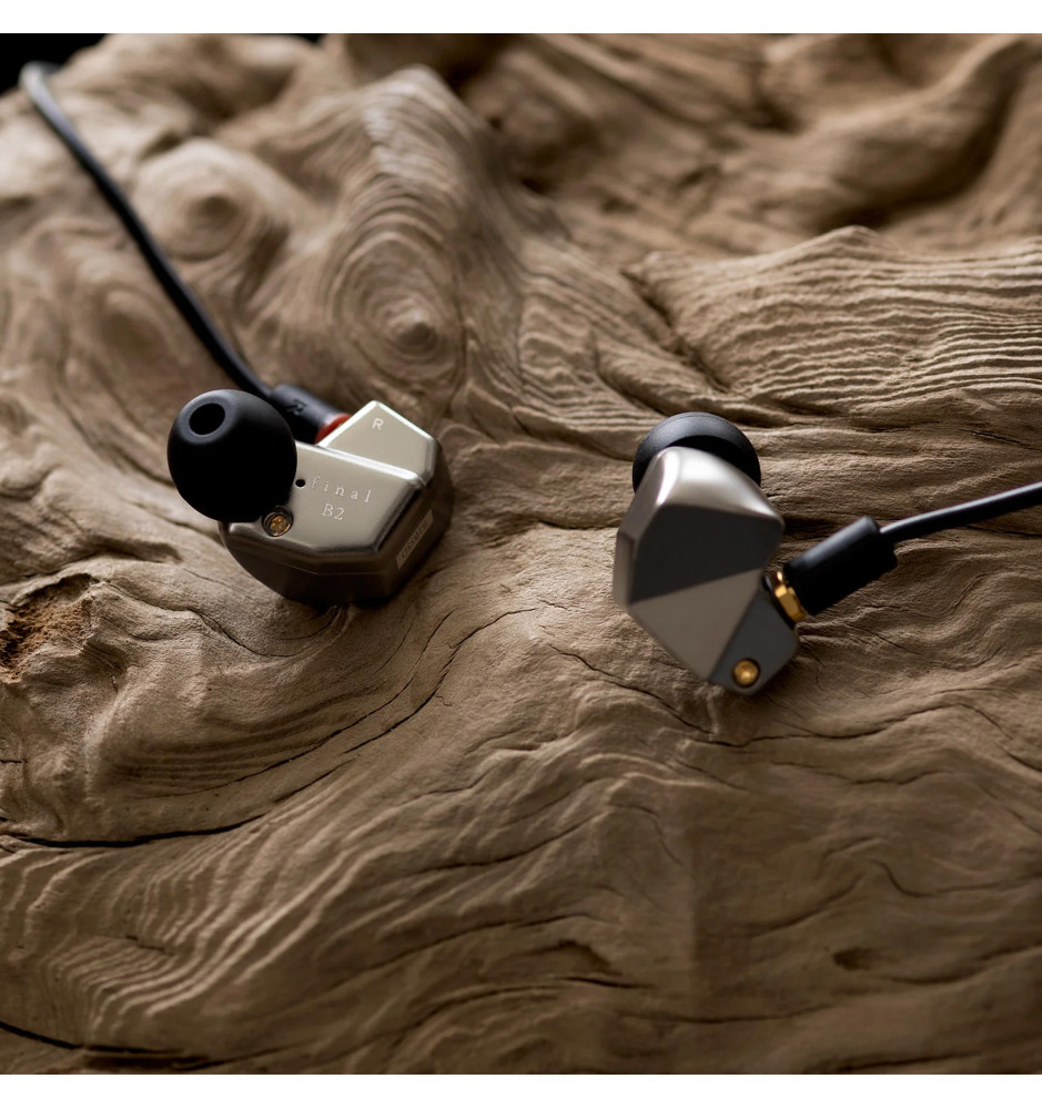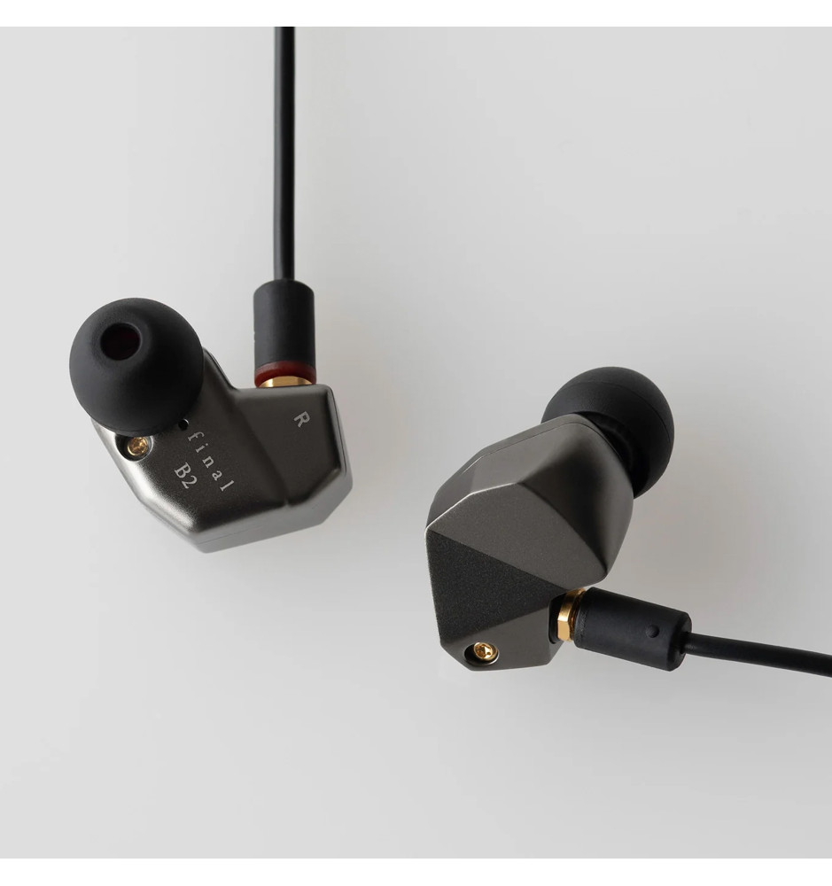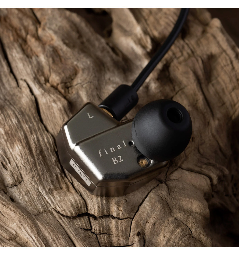 Final Audio B2 wykorzystuje technologię Metal Injection Molding (MIM), dzięki czemu posiada niezwykle trwałą i precyzyjnie wykonaną obudowę ze stali nierdzewnej o eleganckim wykończeniu Gun Metal. Dwuczęściowa konstrukcja umożliwia łatwiejszy serwis, a odpowiednie wyważenie korpusu poprawia komfort i stabilność w uchu.