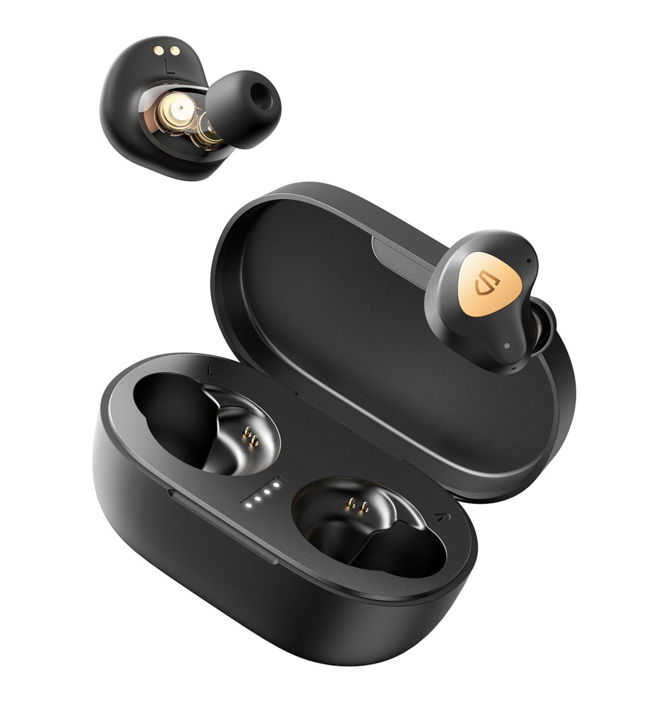 Wykorzystujące podwójne 6-milimetrowe przetworniki dynamiczne i opatentowaną zwrotnicę, kompaktowe, sterowane za pomocą dotyku w pełni bezprzewodowe słuchawki dokanałowe Bluetooth 5.0.