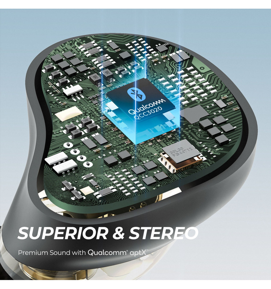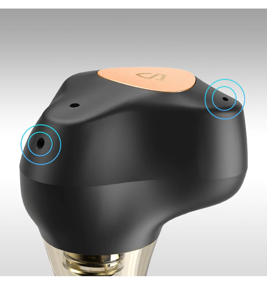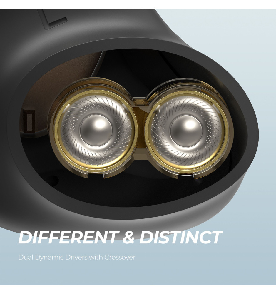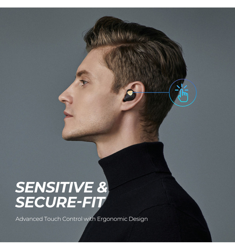 Wykorzystujące podwójne 6-milimetrowe przetworniki dynamiczne i opatentowaną zwrotnicę, kompaktowe, sterowane za pomocą dotyku w pełni bezprzewodowe słuchawki dokanałowe Bluetooth 5.0. Ich idealne dopasowanie gwarantuje skuteczne pasywne tłumienie hałasu z otoczenia, a 4 wbudowane mikrofony z technologią CVC dbają o krystalicznie czystą jakość głosu podczas rozmów.