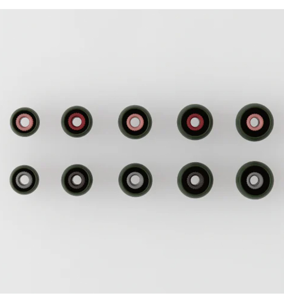 Dzięki oryginalnym, silikonowym końcówkom typu E w pięciu rozmiarach (SS/S/M/L/LL), dopasowanie do ucha jest indywidualne i pewne. Miękka część, która dotyka ucha, zapewnia komfort nawet podczas długich sesji. Do słuchawek dołączone są zaczepy na ucho typu B z mechanizmem blokującym, które stabilizują kabel wokół ucha. Dzięki temu ograniczone jest przesuwanie się przewodu i zakłócenia generowane przez dotyk.