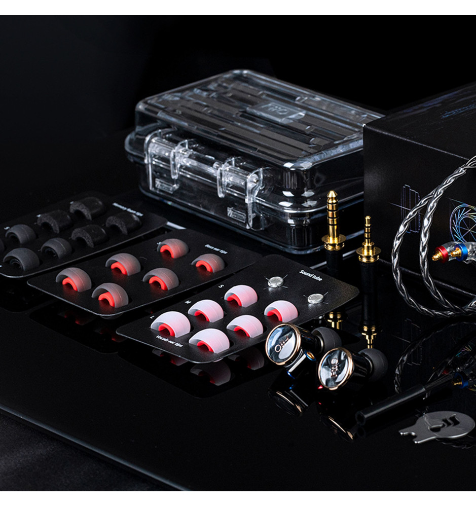 Korpus słuchawek wykonano ze stopu aluminium i magnezu obrabianego CNC oraz ręcznie polerowanego. Transparentny wygląd słuchawki zawdzięczają panelowi z celuloidu powlekanego szkłem 2.5D. Ekskluzywny wymienny kabel z 3 wtykami do wyboru (2,5mm/3,5mm/4,4mm), wykorzystujący złącza MMCX, składa się z 8 splotów po 19 przewodów (łącznie 152) z posrebrzanej monokrystalicznej miedzi.