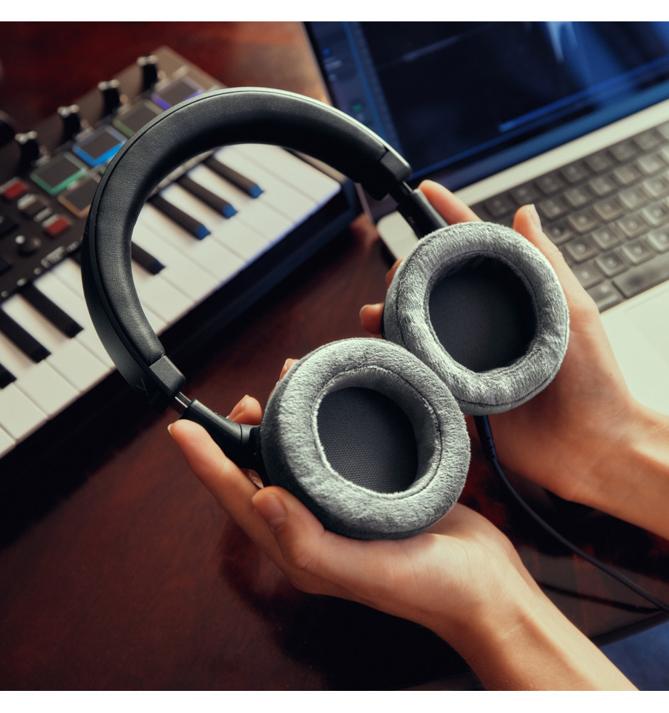 Miękkie nauszniki welurowe oraz lekka konstrukcja (zaledwie 194 g bez kabla) gwarantują wygodę nawet przy wielogodzinnej pracy. Elastyczny pałąk ze stali sprężynowej dopasowuje się do kształtu głowy, zapewniając stabilne i komfortowe dopasowanie.